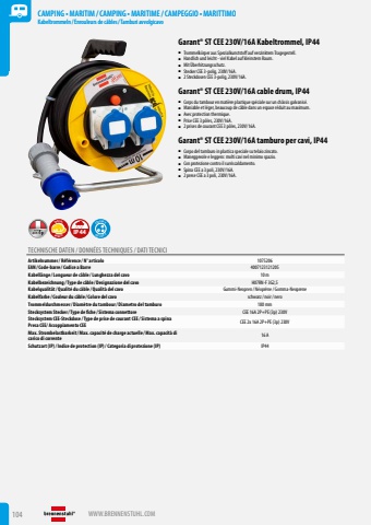 104 WWW.BRENNENSTUHL.COMCAMPING %u2022 MARITIM/CAMPING %u2022 MARITIME/CAMPEGGIO %u2022 MARITTIMOKabeltrommeln / Enrouleurs de c%u00e2bles/ Tamburi avvolgicavoCAMPING %u2022 MARITIM/CAMPING %u2022 MARITIME/CAMPEGGIO %u2022 MARITTIMOKabeltrommeln / Enrouleurs de c%u00e2bles/ Tamburi avvolgicavoGarant%u00ae ST CEE 230V/16A Kabeltrommel, IP44%u25a0 Trommelk%u00f6rper aus Spezialkunststoff auf verzinktem Tragegestell.%u25a0 Handlich und leicht - viel Kabel auf kleinstem Raum.%u25a0 Mit %u00dcberhitzungsschutz.%u25a0 Stecker CEE 3-polig, 230V/16A.%u25a0 2 Steckdosen CEE 3-polig, 230V/16A.Garant%u00ae ST CEE 230V/16A cable drum, IP44%u25a0 Corps du tambour en mati%u00e8re plastique sp%u00e9ciale sur un ch%u00e2ssis galvanis%u00e9.%u25a0 Maniable et l%u00e9ger, beaucoup de c%u00e2ble dans un espace r%u00e9duit au maximum.%u25a0 Avec protection thermique.%u25a0 Prise CEE 3 p%u00f4les, 230V/16A.%u25a0 2 prises de courant CEE 3 p%u00f4les, 230V/16A.Garant%u00ae ST CEE 230V/16A tamburo per cavi, IP44%u25a0 Corpo del tamburo in plastica speciale su telaio zincato.%u25a0 Maneggevole e leggero: molti cavi nel minimo spazio.%u25a0 Con protezione contro il surriscaldamento.%u25a0 Spina CEE a 3 poli, 230V/16A.%u25a0 2 prese CEE a 3 poli, 230V/16A.ROBUSTSPECIALIP44 CEE 230 VCEE 230 VTECHNISCHE DATEN / DONN%u00c9ES TECHNIQUES / DATI TECNICIArtikelnummer/ R%u00e9f%u00e9rence / N%u00b0 articolo 1075206EAN/ Code-barre / Codice a Barre 4007123121205Kabell%u00e4nge / Longueur de c%u00e2ble / Lunghezza del cavo 10 mKabelbezeichnung / Type de c%u00e2ble / Designazione del cavo H07RN-F 3G2,5Kabelqualit%u00e4t/ Qualit%u00e9 du c%u00e2ble / Qualit%u00e0 del cavo Gummi-Neopren / N%u00e9opr%u00e8ne/ Gomma-NeopreneKabelfarbe / Couleur du c%u00e2ble / Colore del cavo schwarz/ noir/ neroTrommeldurchmesser/ Diam%u00e8tre du tambour/ Diametro del tamburo 180 mmStecksystem Stecker/ Type de fiche / Sistema connettore CEE 16A 2P+PE (3p) 230VStecksystem CEE-Steckdose / Type de prise de courant CEE/ Sistema a spina Presa CEE/ Accoppiamento CEE CEE 2x 16A 2P+PE (3p) 230VMax. Strombelastbarkeit/ Max. capacit%u00e9 de charge actuelle / Max. capacit%u00e0 di carico di corrente 16 ASchutzart (IP)/ Indice de protection (IP)/ Categoria di protezione (IP) IP44