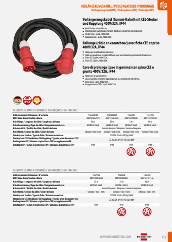 WWW.BRENNENSTUHL.COM 115VERL%u00c4NGERUNGSKABEL/PROLONGATEURS/PROLUNGHEVerl%u00e4ngerungskabel (CEE)/ Prolongateurs (CEE)/ Prolonghe (CEE)VERL%u00c4NGERUNGSKABEL/PROLONGATEURS/PROLUNGHEVerl%u00e4ngerungskabel (CEE)/ Prolongateurs (CEE)/ Prolonghe (CEE)Verl%u00e4ngerungskabel (Gummi-Kabel) mit CEE-Stecker und Kupplung 400V/32A, IP44%u25a0 Ideal f%u00fcr den harten Einsatz.%u25a0 %u00d6lbest%u00e4ndiges Gummikabel f%u00fcr den st%u00e4ndigen Einsatz im Aussenbereich.%u25a0 Stecker CEE 5-polig, 400V/32A.%u25a0 Kupplung CEE 5-polig, 400V/32A.Rallonge (c%u00e2ble en caoutchouc) avec fiche CEE et prise 400V/32A, IP44%u25a0 Id%u00e9al pour les utilisations intensives.%u25a0 C%u00e2ble en caoutchouc r%u00e9sistant %u00e0 l%u2019huile pour une utilisation permanente %u00e0 l%u2019ext%u00e9rieur.%u25a0 Fiche CEE 5 p%u00f4les, 400V/32A.%u25a0 Prise CEE 5 p%u00f4les, 400V/32A.Cavo di prolunga (cavo in gomma) con spina CEE e giunto 400V/32A, IP44%u25a0 Ideale per un uso intensivo.%u25a0 Cavo in gomma resistente agli olii per un uso permanente all%u2019esterno.%u25a0 Spina CEE a 5 poli, 400V/32A.%u25a0 Accoppiamento CEE a 5 poli, 400V/32A.IP44 ROBUSTSPECIALTECHNISCHE DATEN / DONN%u00c9ES TECHNIQUES / DATI TECNICIArtikelnummer/ R%u00e9f%u00e9rence / N%u00b0 articolo 1167320100 1167320250 1166498 1167498EAN/ Code-barre / Codice a Barre 4007123667819 4007123667826 4007123298945 4007123298938Kabell%u00e4nge / Longueur de c%u00e2ble / Lunghezza del cavo 10 m 25 m 5 m 10 mKabelbezeichnung / Type de c%u00e2ble / Designazione del cavo H07RN-F 5G6,0 H07RN-F 5G6,0 H07RN-F 5G4,0 H07RN-F 5G4,0Kabelqualit%u00e4t/ Qualit%u00e9 du c%u00e2ble / Qualit%u00e0 del cavo Gummi-Neopren / N%u00e9opr%u00e8ne/ Gomma-NeopreneKabelfarbe / Couleur du c%u00e2ble / Colore del cavo schwarz/ noir/ nero schwarz/ noir/ nero schwarz/ noir/ nero schwarz/ noir/ neroStecksystem Stecker/ Type de fiche / Sistema connettore CEE 32A 3P+N+PE (5p) 400VStecksystem CEE-Steckdose/ CEE-Kupplung / Type de prise de courant CEE/ Prolongateur CEE/ Sistema a spina Presa CEE/ accoppiamento CEE CEE 1x 32A 3P+N+PE (5p) 400VSchutzart (IP)/ Indice de protection (IP)/ Categoria di protezione (IP) IP44 IP44 IP44 IP44TECHNISCHE DATEN / DONN%u00c9ES TECHNIQUES / DATI TECNICIArtikelnummer/ R%u00e9f%u00e9rence / N%u00b0 articolo 1167768 1169498 1168490EAN/ Code-barre / Codice a Barre 4007123014538 4007123042821 4007123101146Kabell%u00e4nge / Longueur de c%u00e2ble / Lunghezza del cavo 25 m 25 m 30 mKabelbezeichnung / Type de c%u00e2ble / Designazione del cavo H07RN-F 5G4,0 H07RN-F 5G4,0 H07RN-F 5G4,0Kabelqualit%u00e4t/ Qualit%u00e9 du c%u00e2ble / Qualit%u00e0 del cavo Gummi-Neopren / N%u00e9opr%u00e8ne/ Gomma-NeopreneKabelfarbe / Couleur du c%u00e2ble / Colore del cavo schwarz/ noir/ nero schwarz/ noir/ nero schwarz/ noir/ neroStecksystem Stecker/ Type de fiche / Sistema connettore CEE 32A 3P+N+PE (5p) 400VStecksystem CEE-Steckdose/ CEE-Kupplung / Type de prise de courant CEE/ Prolongateur CEE/ Sistema a spina Presa CEE/ accoppiamento CEE CEE 1x 32A 3P+N+PE (5p) 400VSchutzart (IP)/ Indice de protection (IP)/ Categoria di protezione (IP) IP44 IP44 IP44