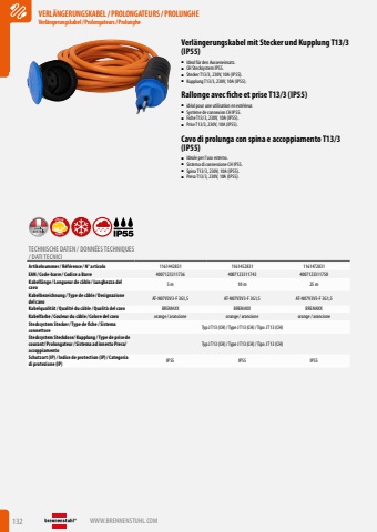 132 WWW.BRENNENSTUHL.COMVERL%u00c4NGERUNGSKABEL/PROLONGATEURS/PROLUNGHEVerl%u00e4ngerungskabel/ Prolongateurs/ ProlungheVERL%u00c4NGERUNGSKABEL/PROLONGATEURS/PROLUNGHEVerl%u00e4ngerungskabel/ Prolongateurs/ ProlungheVerl%u00e4ngerungskabel mit Stecker und Kupplung T13/3 (IP55)%u25a0 Ideal f%u00fcr den Ausseneinsatz.%u25a0 CH Stecksystem IP55.%u25a0 Stecker T13/3, 230V, 10A (IP55).%u25a0 Kupplung T13/3, 230V, 10A (IP55).Rallonge avec fiche et prise T13/3 (IP55)%u25a0 id%u00e9al pour une utilisation en ext%u00e9rieur.%u25a0 Syst%u00e8me de connexion CH IP55.%u25a0 Fiche T13/3, 230V, 10A (IP55).%u25a0 Prise T13/3, 230V, 10A (IP55).Cavo di prolunga con spina e accoppiamento T13/3 (IP55)%u25a0 Ideale per l%u2019uso esterno.%u25a0 Sistema di connessione CH IP55.%u25a0 Spina T13/3, 230V, 10A (IP55).%u25a0 Presa T13/3, 230V, 10A (IP55).ROBUSTSPECIALTECHNISCHE DATEN / DONN%u00c9ES TECHNIQUES / DATI TECNICIArtikelnummer/ R%u00e9f%u00e9rence / N%u00b0 articolo 1161442831 1161452831 1161472831EAN/ Code-barre / Codice a Barre 4007123311736 4007123311743 4007123311750Kabell%u00e4nge / Longueur de c%u00e2ble / Lunghezza del cavo5 m 10 m 25 mKabelbezeichnung / Type de c%u00e2ble / Designazione del cavo AT-N07V3V3-F 3G1,5 AT-N07V3V3-F 3G1,5 AT-N07V3V3-F 3G1,5Kabelqualit%u00e4t/ Qualit%u00e9 du c%u00e2ble / Qualit%u00e0 del cavo BREMAXX BREMAXX BREMAXXKabelfarbe / Couleur du c%u00e2ble / Colore del cavo orange/ arancione orange/ arancione orange/ arancioneStecksystem Stecker/ Type de fiche / Sistema connettore Typ J T13 (CH)/ Type J T13 (CH)/ Tipo J T13 (CH)Stecksystem Steckdose/ Kupplung / Type de prise de courant/ Prolongateur/ Sistema ad innesto Presa/ accoppiamentoTyp J T13 (CH)/ Type J T13 (CH)/ Tipo J T13 (CH)Schutzart (IP)/ Indice de protection (IP)/ Categoria di protezione (IP) IP55 IP55 IP55