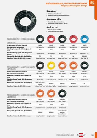 WWW.BRENNENSTUHL.COM 145VERL%u00c4NGERUNGSKABEL/PROLONGATEURS/PROLUNGHEVerl%u00e4ngerungskabel/ Prolongateurs/ ProlungheVERL%u00c4NGERUNGSKABEL/PROLONGATEURS/PROLUNGHEVerl%u00e4ngerungskabel/ Prolongateurs/ ProlungheKabelringe%u25a0 Kabelringe unkonfektioniert.%u25a0 in diversen Farben und Ausf%u00fchrungen erh%u00e4ltlich.Anneaux de c%u00e2ble%u25a0 Anneaux de c%u00e2ble non confectionn%u00e9s.%u25a0 disponibles en diverses couleurs et versions.Anelli per cavi%u25a0 Anelli per cavi non assemblati.%u25a0 Disponibile in vari colori e design.TECHNISCHE DATEN / DONN%u00c9ES TECHNIQUES / DATI TECNICIArtikelnummer/ R%u00e9f%u00e9rence / N%u00b0 articolo 1168240 1168250 1168282 1168292 1168370EAN/ Code-barre / Codice a Barre 4007123003754 4007123003761 4007123010547 4007123010554 4007123299348Kabell%u00e4nge / Longueur de c%u00e2ble / Lunghezza del cavo100 m 100 m 100 m 100 m 100 mKabelbezeichnung / Type de c%u00e2ble / Designazione del cavo H05VV-F 3G1,0 H05VV-F 3G1,0 H05VV-F 3G1,5 H05VV-F 3G1,5 AT-N05V3V3-F 3G1,5Kabelqualit%u00e4t/ Qualit%u00e9 du c%u00e2ble / Qualit%u00e0 del cavo PVC PVC PVC PVC BREMAXXKabelfarbe / Couleur du c%u00e2ble / Colore del cavo schwarz/ noir/ nero rot/ rouge/ rosso schwarz/ noir/ nero rot/ rouge/ rosso blau/ bleu/ bluTECHNISCHE DATEN / DONN%u00c9ES TECHNIQUES / DATI TECNICIArtikelnummer/ R%u00e9f%u00e9rence / N%u00b0 articolo 1168272 1168318 1168310 1168410 1168550050EAN/ Code-barre / Codice a Barre 4007123010639 4007123304356 4007123018031 4007123018048 4007123183357Kabell%u00e4nge / Longueur de c%u00e2ble / Lunghezza del cavo100 m 100 m 100 m 100 m 50 mKabelbezeichnung / Type de c%u00e2ble / Designazione del cavo H05RR-F 3G1,5 AT-N07V3V3-F 3G1,5 AT-N07V3V3-F 3G1,5 AT-N07V3V3-F 3G2,5 H05VV-F 5G1,5Kabelqualit%u00e4t/ Qualit%u00e9 du c%u00e2ble / Qualit%u00e0 del cavo Gummi/ Caoutchouc/Gomma BREMAXX BREMAXX BREMAXX PVCKabelfarbe / Couleur du c%u00e2ble / Colore del cavo schwarz/ noir/ nero gelb/ jaune/ gialloa orange/ arancione orange/ arancione schwarz/ noir/ neroTECHNISCHE DATEN / DONN%u00c9ES TECHNIQUES / DATI TECNICIArtikelnummer/ R%u00e9f%u00e9rence / N%u00b0 articolo 1168510 1168610 1168360050EAN/ Code-barre / Codice a Barre 4007123018055 4007123018062 4007123282692Kabell%u00e4nge / Longueur de c%u00e2ble / Lunghezza del cavo100 m 100 m 50 mKabelbezeichnung / Type de c%u00e2ble / Designazione del cavo AT-N07V3V3-F 5G1,5 AT-N07V3V3-F 5G2,5 H07RN-F 5G4,0Kabelqualit%u00e4t/ Qualit%u00e9 du c%u00e2ble / Qualit%u00e0 del cavoBREMAXX BREMAXXGummi-Neopren / N%u00e9opr%u00e8ne/ Gomma-NeopreneKabelfarbe / Couleur du c%u00e2ble / Colore del cavo orange/ arancione orange/ arancione schwarz/ noir/ nero