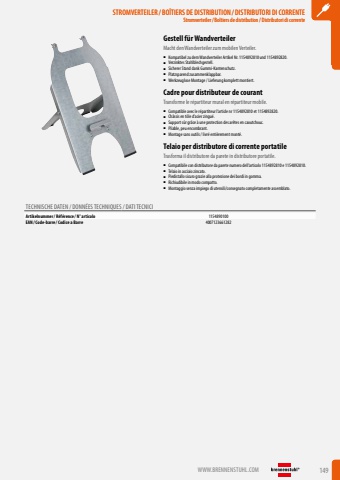 WWW.BRENNENSTUHL.COM 149STROMVERTEILER / BO%u00ceTIERS DE DISTRIBUTION / DISTRIBUTORI DI CORRENTEStromverteiler/ Bo%u00eetiers de distribution / Distributori di correnteSTROMVERTEILER / BO%u00ceTIERS DE DISTRIBUTION / DISTRIBUTORI DI CORRENTEStromverteiler/ Bo%u00eetiers de distribution / Distributori di correnteGestell f%u00fcr WandverteilerMacht den Wandverteiler zum mobilen Verteiler.%u25a0 Kompatibel zu dem Wandverteiler Artikel Nr. 1154892810 und 1154892820.%u25a0 Verzinktes Stahlblechgestell.%u25a0 Sicherer Stand dank Gummi-Kantenschutz.%u25a0 Platzsparend zusammenklappbar.%u25a0 Werkzeuglose Montage / Lieferung komplett montiert.Cadre pour distributeur de courantTransforme le r%u00e9partiteur mural en r%u00e9partiteur mobile.%u25a0 Compatible avec le r%u00e9partiteur l%u2019article nr 1154892810 et 1154892820.%u25a0 Ch%u00e2ssis en t%u00f4le d%u2019acier zingu%u00e9.%u25a0 Support s%u00fbr gr%u00e2ce %u00e0 une protection des ar%u00eates en caoutchouc.%u25a0 Pliable, peu encombrant.%u25a0 Montage sans outils / livr%u00e9 enti%u00e8rement mont%u00e9.Telaio per distributore di corrente portatileTrasforma il distributore da parete in distributore portatile.%u25a0 Compatibile con distributore da parete numero dell%u2019articolo 1154892810 e 1154892810.%u25a0 Telaio in acciaio zincato.%u25a0 Piedistallo sicuro grazie alla protezione dei bordi in gomma.%u25a0 Richiudibile in modo compatto.%u25a0 Montaggio senza impiego di utensili/consegnato completamente assemblato.TECHNISCHE DATEN / DONN%u00c9ES TECHNIQUES / DATI TECNICIArtikelnummer/ R%u00e9f%u00e9rence / N%u00b0 articolo 1154890100EAN/ Code-barre / Codice a Barre 4007123661282
