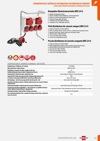 WWW.BRENNENSTUHL.COM 155STROMVERTEILER / BO%u00ceTIERS DE DISTRIBUTION / DISTRIBUTORI DI CORRENTEStromverteiler/ Bo%u00eetiers de distribution / Distributori di correnteSTROMVERTEILER / BO%u00ceTIERS DE DISTRIBUTION / DISTRIBUTORI DI CORRENTEStromverteiler/ Bo%u00eetiers de distribution / Distributori di correnteKompakter Kleinstromverteiler BKV 2/4 G%u25a0 Ideal f%u00fcr den belastbaren Einsatz.%u25a0 Stabiles, schlagfestes Kunststoffgeh%u00e4use, spritzwassergesch%u00fctzt.%u25a0 Robustes, verzinktes Stahlrohrgestell f%u00fcr sicheren Stand.%u25a0 Stecker CEE 5-polig, 400V, 16A (IP44)%u25a0 2 Steckdose CEE 5-polig, 400V, 16A (IP44).%u25a0 4 Steckdosen T25/5, 230V/400V, 16A (IP55).Petit distributeur de courant compact BKV 2/4 G%u25a0 Id%u00e9al pour l%u2019utilisation en milieux difficiles.%u25a0 Bo%u00eetier en plastique robuste, r%u00e9sistant aux chocs, prot%u00e9g%u00e9 contre les projections d%u2019eau.%u25a0 Support en tube d%u2019acier, robuste, zingu%u00e9, pour une position stable.%u25a0 Fiche CEE 5 p%u00f4les , 400V, 16A (IP44).%u25a0 2 Prises CEE 5 p%u00f4les, 400V, 16A (IP44).%u25a0 4 Prises T25/5, 230V/400V, 16A (IP55).Piccolo distributore di corrente compatto BKV 2/4 G%u25a0 Ideale per l%u2019impiego in condizioni difficil.%u25a0 Stabile alloggiamento in plastica antiurto, protetto contro gli spruzzi d%u2019acqua.%u25a0 Robusto supporto in tubo d%u2019acciaio zincato per una stabilit%u00e0 sicura.%u25a0 Spina CEE 5 poli, 400V, 16A (IP44).%u25a0 2 Prese CEE 5 poli, 400V, 16A (P44).%u25a0 4 Prese T25/5, 230V/400V, 16A (IP55).ROBUSTSPECIALIP44CEECH/T25IP55TECHNISCHE DATEN / DONN%u00c9ES TECHNIQUES / DATI TECNICIArtikelnummer/ R%u00e9f%u00e9rence / N%u00b0 articolo 1153752800EAN/ Code-barre / Codice a Barre 4007123311675Kabell%u00e4nge / Longueur de c%u00e2ble / Lunghezza del cavo 2 mKabelbezeichnung / Type de c%u00e2ble / Designazione del cavo H07RN-F 5G2,5Kabelqualit%u00e4t/ Qualit%u00e9 du c%u00e2ble / Qualit%u00e0 del cavo Gummi-Neopren / N%u00e9opr%u00e8ne/ Gomma-NeopreneSchutzart (IP)/ Indice de protection (IP)/ Categoria di protezione (IP) IP44FI-Schalter/ Interrupteur diff%u00e9rentiel/ Interruttore differenziale Ohne/ Sans/ SenzaCEE-Steckdose - 16A / Prise de courant CEE 16A / Presa CEE - 16A CEE 2x 16A 3P+N+PE (5p) 400VAnzahl der Steckdosen gesamt/ Nombre global de prises de courant/ Numero totale di prese 6Stecksystem Steckdose / Type de prise de courant/ Sistema presa Typ J T25 (CH)/ Type J T25 (CH)/ Tipo J T25 (CH)Einspeisung/ Anschlussm%u00f6glichkeit- e / Raccordement / possibilit%u00e9s d%u2019alimentation / Opzioni di alimentazione/ collegamento Zuleitung mit Stecker/ C%u00e2ble d%u2019alimentation avec fiche/ Cavo di alimentazione con spinaStecksystem Stecker/ Type de fiche / Sistema connettore CEE 16A 3P+N+PE (5p) 400VMax. Strombelastbarkeit/ Max. capacit%u00e9 de charge actuelle / Max. capacit%u00e0 di carico di corrente 16 A