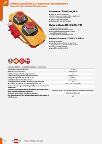 158 WWW.BRENNENSTUHL.COMSTROMVERTEILER / BO%u00ceTIERS DE DISTRIBUTION / DISTRIBUTORI DI CORRENTEStromverteiler/ Bo%u00eetiers de distribution / Distributori di correnteSTROMVERTEILER / BO%u00ceTIERS DE DISTRIBUTION / DISTRIBUTORI DI CORRENTEStromverteiler/ Bo%u00eetiers de distribution / Distributori di correnteStromstation CEE 400V/16A, IP 44%u25a0 Ideal f%u00fcr den Einsatz im Aussenbereich.%u25a0 Praktische Aufwickelvorrichtung zur Aufbewahrung des Kabels.%u25a0 Geh%u00e4use aus hochbruchfestem Kunststoff.%u25a0 Stecker CEE 5-polig, 400V/16A (IP44).%u25a0 2 Steckdosen CEE 5-polig, 400V/16A (IP44).Station multiprise CEE 400 V/16 A IP 44%u25a0 Id%u00e9al pour une utilisation en ext%u00e9rieur.%u25a0 Enrouleur pratique pour le rangement du c%u00e2ble.%u25a0 Bo%u00eetier en plastique hautement r%u00e9sistant %u00e0 la rupture.%u25a0 Fiche CEE 5 p%u00f4les, 400V/16A (IP44).%u25a0 2 prises de courant CEE 5 p%u00f4les, 400V/16A (IP44).Stazione di corrente CEE 400 V/16 A IP 44%u25a0 Ideale per l%u2019uso all%u2019aperto.%u25a0 Pratico dispositivo di riavvolgimento per riporre il cavo.%u25a0 Alloggiamento in plastica altamente resistente alla rottura.%u25a0 Spina CEE a 5 poli, 400V/16A (IP44).%u25a0 2 prese CEE a 5 poli, 400V/16A (IP44).ROBUSTSPECIALIP44TECHNISCHE DATEN / DONN%u00c9ES TECHNIQUES / DATI TECNICIArtikelnummer/ R%u00e9f%u00e9rence / N%u00b0 articolo 1152408EAN/ Code-barre / Codice a Barre 4007123042838Kabell%u00e4nge / Longueur de c%u00e2ble / Lunghezza del cavo 2 mKabelbezeichnung / Type de c%u00e2ble / Designazione del cavo AT-N07V3V3-F 5G2,5Kabelqualit%u00e4t/ Qualit%u00e9 du c%u00e2ble / Qualit%u00e0 del cavo BREMAXXKabelfarbe / Couleur du c%u00e2ble / Colore del cavo orange/ arancioneSchutzart (IP)/ Indice de protection (IP)/ Categoria di protezione (IP) IP44CEE-Steckdose - 16A / Prise de courant CEE 16A / Presa CEE - 16A CEE 2x 16A 3P+N+PE (5p) 400VAnzahl der Steckdosen gesamt/ Nombre global de prises de courant/ Numero totale di prese 2Einspeisung/ Anschlussm%u00f6glichkeit- e / Raccordement / possibilit%u00e9s d%u2019alimentation / Opzioni di alimentazione/ collegamento Zuleitung mit Stecker/ C%u00e2ble d%u2019alimentation avec fiche/ Cavo di alimentazione con spinaStecksystem Stecker/ Type de fiche / Sistema connettore CEE 16A 3P+N+PE (5p) 400VMax. Strombelastbarkeit/ Max. capacit%u00e9 de charge actuelle / Max. capacit%u00e0 di carico di corrente 16 A
