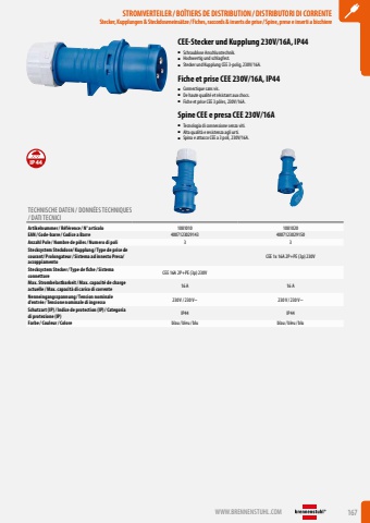 WWW.BRENNENSTUHL.COM 167STROMVERTEILER / BO%u00ceTIERS DE DISTRIBUTION / DISTRIBUTORI DI CORRENTEStecker, Kupplungen & Steckdoseneins%u00e4tze/ Fiches, raccords & inserts de prise/ Spine, prese e inserti a bicchiereSTROMVERTEILER / BO%u00ceTIERS DE DISTRIBUTION / DISTRIBUTORI DI CORRENTEStecker, Kupplungen & Steckdoseneins%u00e4tze/ Fiches, raccords & inserts de prise/ Spine, prese e inserti a bicchiereCEE-Stecker und Kupplung 230V/16A, IP44%u25a0 Schraublose Anschlusstechnik.%u25a0 Hochwertig und schlagfest.%u25a0 Stecker und Kupplung CEE 3-polig, 230V/16A.Fiche et prise CEE 230V/16A, IP44%u25a0 Connectique sans vis.%u25a0 De haute qualit%u00e9 et r%u00e9sistant aux chocs.%u25a0 Fiche et prise CEE 3 p%u00f4les, 230V/16A.Spine CEE e presa CEE 230V/16A%u25a0 Tecnologia di connessione senza viti.%u25a0 Alta qualit%u00e0 e resistenza agli urti.%u25a0 Spina e attacco CEE a 3 poli, 230V/16A.TECHNISCHE DATEN / DONN%u00c9ES TECHNIQUES / DATI TECNICIArtikelnummer/ R%u00e9f%u00e9rence / N%u00b0 articolo 1081010 1081020EAN/ Code-barre / Codice a Barre 4007123029143 4007123029150Anzahl Pole / Nombre de p%u00f4les/ Numero di poli 3 3Stecksystem Steckdose/ Kupplung / Type de prise de courant/ Prolongateur/ Sistema ad innesto Presa/ accoppiamentoCEE 1x 16A 2P+PE (3p) 230VStecksystem Stecker/ Type de fiche / Sistema connettore CEE 16A 2P+PE (3p) 230VMax. Strombelastbarkeit/ Max. capacit%u00e9 de charge actuelle / Max. capacit%u00e0 di carico di corrente 16 A 16 ANenneingangsspannung / Tension nominale d%u2019entr%u00e9e / Tensione nominale di ingresso 230 V / 230 V~ 230 V / 230 V~Schutzart (IP)/ Indice de protection (IP)/ Categoria di protezione (IP) IP44 IP44Farbe / Couleur/ Colore blau/ bleu/ blu blau/ bleu/ bluIP44