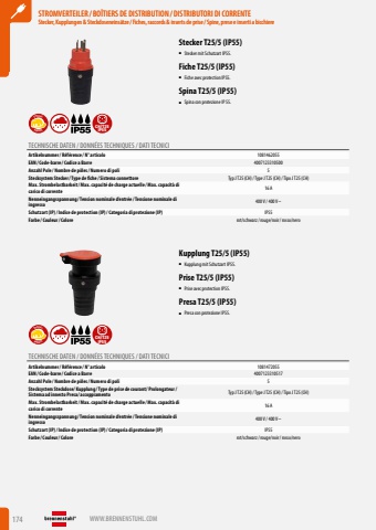174 WWW.BRENNENSTUHL.COMSTROMVERTEILER / BO%u00ceTIERS DE DISTRIBUTION / DISTRIBUTORI DI CORRENTEStecker, Kupplungen & Steckdoseneins%u00e4tze/ Fiches, raccords & inserts de prise/ Spine, prese e inserti a bicchiereSTROMVERTEILER / BO%u00ceTIERS DE DISTRIBUTION / DISTRIBUTORI DI CORRENTEStecker, Kupplungen & Steckdoseneins%u00e4tze/ Fiches, raccords & inserts de prise/ Spine, prese e inserti a bicchiereStecker T25/5 (IP55)%u25a0 Stecker mit Schutzart IP55.Fiche T25/5 (IP55)%u25a0 Fiche avec protection IP55.Spina T25/5 (IP55)%u25a0 Spina con protezione IP 55.ROBUSTSPECIALCH/T25IP55TECHNISCHE DATEN / DONN%u00c9ES TECHNIQUES / DATI TECNICIArtikelnummer/ R%u00e9f%u00e9rence / N%u00b0 articolo 1081462055EAN/ Code-barre / Codice a Barre 4007123310500Anzahl Pole / Nombre de p%u00f4les/ Numero di poli 5Stecksystem Stecker/ Type de fiche / Sistema connettore Typ J T25 (CH)/ Type J T25 (CH)/ Tipo J T25 (CH)Max. Strombelastbarkeit/ Max. capacit%u00e9 de charge actuelle / Max. capacit%u00e0 di carico di corrente 16 ANenneingangsspannung / Tension nominale d%u2019entr%u00e9e / Tensione nominale di ingresso 400 V / 400 V~Schutzart (IP)/ Indice de protection (IP)/ Categoria di protezione (IP) IP55Farbe / Couleur/ Colore rot/schwarz/ rouge/noir/ rosso/neroKupplung T25/5 (IP55)%u25a0 Kupplung mit Schutzart IP55.Prise T25/5 (IP55)%u25a0 Prise avec protection IP55.Presa T25/5 (IP55)%u25a0 Presa con protezione IP55.ROBUSTSPECIALCH/T25IP55TECHNISCHE DATEN / DONN%u00c9ES TECHNIQUES / DATI TECNICIArtikelnummer/ R%u00e9f%u00e9rence / N%u00b0 articolo 1081472055EAN/ Code-barre / Codice a Barre 4007123310517Anzahl Pole / Nombre de p%u00f4les/ Numero di poli 5Stecksystem Steckdose/ Kupplung / Type de prise de courant/ Prolongateur/ Sistema ad innesto Presa/ accoppiamento Typ J T25 (CH)/ Type J T25 (CH)/ Tipo J T25 (CH)Max. Strombelastbarkeit/ Max. capacit%u00e9 de charge actuelle / Max. capacit%u00e0 di carico di corrente 16 ANenneingangsspannung / Tension nominale d%u2019entr%u00e9e / Tensione nominale di ingresso 400 V / 400 V~Schutzart (IP)/ Indice de protection (IP)/ Categoria di protezione (IP) IP55Farbe / Couleur/ Colore rot/schwarz/ rouge/noir/ rosso/nero