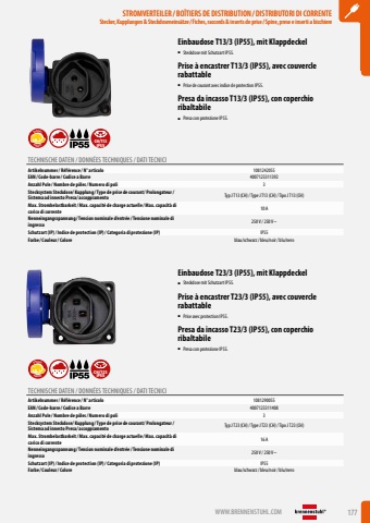 WWW.BRENNENSTUHL.COM 177STROMVERTEILER / BO%u00ceTIERS DE DISTRIBUTION / DISTRIBUTORI DI CORRENTEStecker, Kupplungen & Steckdoseneins%u00e4tze/ Fiches, raccords & inserts de prise/ Spine, prese e inserti a bicchiereSTROMVERTEILER / BO%u00ceTIERS DE DISTRIBUTION / DISTRIBUTORI DI CORRENTEStecker, Kupplungen & Steckdoseneins%u00e4tze/ Fiches, raccords & inserts de prise/ Spine, prese e inserti a bicchiereEinbaudose T13/3 (IP55), mit Klappdeckel%u25a0 Steckdose mit Schutzart IP55.Prise %u00e0 encastrer T13/3 (IP55), avec couvercle rabattable%u25a0 Prise de courant avec indice de protection IP55.Presa da incasso T13/3 (IP55), con coperchio ribaltabile%u25a0 Presa con protezione IP55.ROBUSTSPECIALCH/T13IP55TECHNISCHE DATEN / DONN%u00c9ES TECHNIQUES / DATI TECNICIArtikelnummer/ R%u00e9f%u00e9rence / N%u00b0 articolo 1081242055EAN/ Code-barre / Codice a Barre 4007123311392Anzahl Pole / Nombre de p%u00f4les/ Numero di poli 3Stecksystem Steckdose/ Kupplung / Type de prise de courant/ Prolongateur/ Sistema ad innesto Presa/ accoppiamento Typ J T13 (CH)/ Type J T13 (CH)/ Tipo J T13 (CH)Max. Strombelastbarkeit/ Max. capacit%u00e9 de charge actuelle / Max. capacit%u00e0 di carico di corrente 10 ANenneingangsspannung / Tension nominale d%u2019entr%u00e9e / Tensione nominale di ingresso 250 V / 250 V~Schutzart (IP)/ Indice de protection (IP)/ Categoria di protezione (IP) IP55Farbe / Couleur/ Colore blau/schwarz/ bleu/noir/ blu/neroEinbaudose T23/3 (IP55), mit Klappdeckel%u25a0 Steckdose mit Schutzart IP55.Prise %u00e0 encastrer T23/3 (IP55), avec couvercle rabattable%u25a0 Prise avec protection IP55.Presa da incasso T23/3 (IP55), con coperchio ribaltabile%u25a0 Presa con protezione IP55.ROBUSTSPECIALCH/T23IP55TECHNISCHE DATEN / DONN%u00c9ES TECHNIQUES / DATI TECNICIArtikelnummer/ R%u00e9f%u00e9rence / N%u00b0 articolo 1081290055EAN/ Code-barre / Codice a Barre 4007123311408Anzahl Pole / Nombre de p%u00f4les/ Numero di poli 3Stecksystem Steckdose/ Kupplung / Type de prise de courant/ Prolongateur/ Sistema ad innesto Presa/ accoppiamento Typ J T23 (CH)/ Type J T23 (CH)/ Tipo J T23 (CH)Max. Strombelastbarkeit/ Max. capacit%u00e9 de charge actuelle / Max. capacit%u00e0 di carico di corrente 16 ANenneingangsspannung / Tension nominale d%u2019entr%u00e9e / Tensione nominale di ingresso 250 V / 250 V~Schutzart (IP)/ Indice de protection (IP)/ Categoria di protezione (IP) IP55Farbe / Couleur/ Colore blau/schwarz/ bleu/noir/ blu/nero