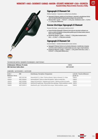 WWW.BRENNENSTUHL.COM 195WERKSTATT %u2022 HAUS %u2022 SICHERHEIT/ GARAGE %u2022 MAISON %u2022 S%u00c9CURIT%u00c9/WORKSHOP %u2022 CASA %u2022 SICUREZZAHaushalt & Hobby/ Maison & Atelier/ Domestica e HobbyWERKSTATT %u2022 HAUS %u2022 SICHERHEIT/ GARAGE %u2022 MAISON %u2022 S%u00c9CURIT%u00c9/WORKSHOP %u2022 CASA %u2022 SICUREZZAHaushalt & Hobby/ Maison & Atelier/ Domestica e HobbySignograph 25 Diamant-SetElektro-Gravierer - Gravieren so einfach wie schreiben.%u25a0 Signograph 25 Diamant, geliefert im Set mit Diamant-, Hartmetall- und geh%u00e4rtetem Stichel, sowie zwei Modellierstiften f%u00fcr Weichmetalle wie Kupfer, Zinn und Alu-Folie.%u25a0 Vibrationsst%u00e4rke: a (peak)~= 74,02 m/s%u00b2 = 7,545 g (max. Scheitelwert) a (rms)~= 52,34 m/s%u00b2 = 5,336 g (max. Effektivwert).Graveur %u00e9lectrique Signograph 25 DiamantGraveur %u00e9lectrique - pour graver comme on %u00e9crit.%u25a0 Graveur %u00e9lectrique Signograph 25 Diamant, livr%u00e9 en kit avec une pointe au diamant, une pointe au carbure de tungst%u00e8ne et deux pointes profil%u00e9es pour les m%u00e9taux tendres comme le cuivre, le zinc ou l%u2019aluminium.%u25a0 Intensit%u00e9 des vibrations%u00a0: a (peak)~= 74,02m/s%u00b2 = 7,545g (valeur maximale usine) a (rms)~= 52,34m/s%u00b2 = 5,336g (valeur nominale).Signograph 25 Diamant-SetIncisori elettrici - Incidere diventa facile come scrivere.%u25a0 Signograph 25 Diamant, fornito in set con bulino di diamante, in metallo duro e temprato, nonch%u00e9 due matite modellanti per metalli morbidi come rame, stagno e fogli di alluminio.%u25a0 Grandezza di vibrazione: a (peak)~= 74,02m/s%u00b2 = 7,545 g (valore vertice max.) a (rms)~= 52,34 m/s%u00b2 = 5,336 g (valore effettivo max.).TECHNISCHE DATEN / DONN%u00c9ES TECHNIQUES / DATI TECNICIArtikelnummer/ R%u00e9f%u00e9rence / N%u00b0 articolo 1500762EAN/ Code-barre / Codice a Barre 4007123014699ZUBEH%u00d6R / ACCESSOIRES/ ACCESSORIArt.Nr./R%u00e9f%u00e9rence / Art.no.EAN Bezeichnung / Description / Designazione zu Art.Nr./ Pour les r%u00e9f%u00e9rences/per Art. no.1500530 4007123011964 Diamantstichel 2,5 x 18mm/ Pointe au diamant/ Bulino in diamante 2,5 x 18mm 15007621500540 4007123020492 Hartmetallstichel/ Pointe au carbure de tungst%u00e8ne/ Bulino in metallo duro 15007621508130 4007123020485 Adapter f%u00fcr Ersatzstichel/ Adaptateur porte-pointes/ Adattore per bulino di ricambio 15007621508240 4007123020508 Modellierstift, kugelf%u00f6rmig/ Pointe profil%u00e9e forme sph%u00e9rique/ Matita modellante, rotonda 15007621508250 4007123020515 Modellierstift, spitz/ Pointe profil%u00e9e forme conique/ Matita modellante, a punta 1500762