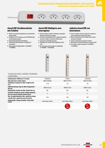 WWW.BRENNENSTUHL.COM 33STECKDOSENLEISTEN /PROLONGATEURS MULTIPRISES/PRESE MULTIPLESteckdosenleisten / Prolongateurs multiprises/ Prese multipleSTECKDOSENLEISTEN /PROLONGATEURS MULTIPRISES/PRESE MULTIPLESteckdosenleisten / Prolongateurs multiprises/ Prese multiplecleverLINE Steckdosenleiste mit SchaltercleverLINE Multiprise avec interrupteurciabatta cleverLINE con interruttore %u25a0 Stabile, formsch%u00f6ne Kompaktleiste aus hochbruchfestem Kunststoff.%u25a0 Steckdosen in 90%u00b0-Anordnung, auch f%u00fcr Winkelstecker und Netzger%u00e4te geeignet.%u25a0 Komfortable Abst%u00e4nde der Steckdosen.%u25a0 Sicherheitsschalter beleuchtet, zweipolig ein-/ausschaltbar.%u25a0 Nicht geeignet f%u00fcr Magnethalter (1159460007 / 1159460006)%u25a0 Barrette compacte stable et esth%u00e9tique en plastique hautement r%u00e9sistant %u00e0 la rupture.%u25a0 Prises de courant dispos%u00e9es %u00e0 90%u00b0, %u00e9galement adapt%u00e9es aux fiches coud%u00e9es et aux blocs d%u2019alimentation.%u25a0 Espacement confortable des prises.%u25a0 Interrupteur de s%u00e9curit%u00e9 %u00e9clair%u00e9, bipolaire marche/arr%u00eat.%u25a0 Ne convient pas pour les supports magn%u00e9tiques (1159460007 / 1159460006)%u25a0 Striscia compatta, robusta e sagomata, realizzata in plastica altamente resistente alla rottura.%u25a0 Prese con disposizione a 90%u00b0, adatte anche a spine e alimentatori angolati.%u25a0 Spazio conveniente per le prese di corrente.%u25a0 Interruttore di sicurezza illuminato, a due poli on/off.%u25a0 Non adatto a supporti magnetici (1159460007 / 1159460006)TECHNISCHE DATEN / DONN%u00c9ES TECHNIQUES / DATI TECNICIArtikelnummer/ R%u00e9f%u00e9rence / N%u00b0 articolo 1159462614 1159552 1159552426EAN/ Code-barre / Codice a Barre 4007123304462 4007123119271 4007123313846Kabell%u00e4nge / Longueur de c%u00e2ble / Lunghezza del cavo1.5 m 2 m 3 mKabelbezeichnung / Type de c%u00e2ble / Designazione del cavo H05VV-F 3G1,0 H05VV-F 3G1,0 H05VV-F 3G1,0Kabelqualit%u00e4t/ Qualit%u00e9 du c%u00e2ble / Qualit%u00e0 del cavo PVC PVC PVCAnzahl der Steckdosen gesamt/ Nombre global de prises de courant/ Numero totale di prese 4 6 6Max. Strombelastbarkeit/ Max. capacit%u00e9 de charge actuelle / Max. capacit%u00e0 di carico di corrente 10 A 10 A 10 AGeh%u00e4usefarbe / Couleur du bo%u00eetier/ Colore della scatola weiss/ blanc/ bianco weiss/ blanc/ bianco weiss/ blanc/ bianco2m 3m