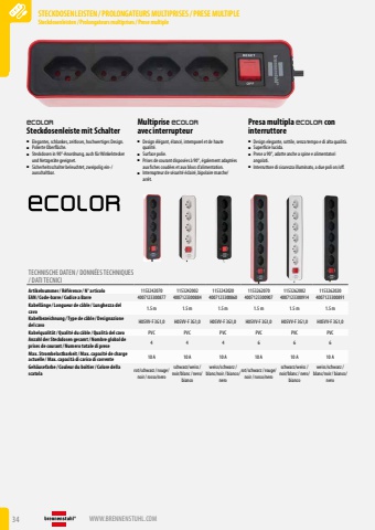 34 WWW.BRENNENSTUHL.COMSTECKDOSENLEISTEN /PROLONGATEURS MULTIPRISES/PRESE MULTIPLESteckdosenleisten / Prolongateurs multiprises/ Prese multipleSTECKDOSENLEISTEN /PROLONGATEURS MULTIPRISES/PRESE MULTIPLESteckdosenleisten / Prolongateurs multiprises/ Prese multiple%uf004Steckdosenleiste mit SchalterMultiprise avec interrupteur%uf004 Presa multipla %uf004 con interruttore %u25a0 Elegantes, schlankes, zeitloses, hochwertiges Design.%u25a0 Polierte Oberfl%u00e4che.%u25a0 Steckdosen in 90%u00b0-Anordnung, auch f%u00fcr Winkelstecker und Netzger%u00e4te geeignet.%u25a0 Sicherheitsschalter beleuchtet, zweipolig ein-/ausschaltbar.%u25a0 Design %u00e9l%u00e9gant, %u00e9lanc%u00e9, intemporel et de haute qualit%u00e9.%u25a0 Surface polie.%u25a0 Prises de courant dispos%u00e9es %u00e0 90%u00b0, %u00e9galement adapt%u00e9es aux fiches coud%u00e9es et aux blocs d%u2019alimentation.%u25a0 Interrupteur de s%u00e9curit%u00e9 %u00e9clair%u00e9, bipolaire marche/arr%u00eat.%u25a0 Design elegante, sottile, senza tempo e di alta qualit%u00e0.%u25a0 Superficie lucida.%u25a0 Prese a 90%u00b0, adatte anche a spine e alimentatori angolati.%u25a0 Interruttore di sicurezza illuminato, a due poli on/off.TECHNISCHE DATEN / DONN%u00c9ES TECHNIQUES / DATI TECNICIArtikelnummer/ R%u00e9f%u00e9rence / N%u00b0 articolo 1153242070 1153242002 1153242020 1153262070 1153262002 1153262020EAN/ Code-barre / Codice a Barre 4007123300877 4007123300884 4007123300860 4007123300907 4007123300914 4007123300891Kabell%u00e4nge / Longueur de c%u00e2ble / Lunghezza del cavo1.5 m 1.5 m 1.5 m 1.5 m 1.5 m 1.5 mKabelbezeichnung / Type de c%u00e2ble / Designazione del cavo H05VV-F 3G1,0 H05VV-F 3G1,0 H05VV-F 3G1,0 H05VV-F 3G1,0 H05VV-F 3G1,0 H05VV-F 3G1,0Kabelqualit%u00e4t/ Qualit%u00e9 du c%u00e2ble / Qualit%u00e0 del cavo PVC PVC PVC PVC PVC PVCAnzahl der Steckdosen gesamt/ Nombre global de prises de courant/ Numero totale di prese 4 4 4 6 6 6Max. Strombelastbarkeit/ Max. capacit%u00e9 de charge actuelle / Max. capacit%u00e0 di carico di corrente 10 A 10 A 10 A 10 A 10 A 10 AGeh%u00e4usefarbe / Couleur du bo%u00eetier/ Colore della scatola rot/schwarz/ rouge/noir/ rosso/neroschwarz/weiss/ noir/blanc/ nero/biancoweiss/schwarz/ blanc/noir/ bianco/nerorot/schwarz/ rouge/noir/ rosso/neroschwarz/weiss/ noir/blanc/ nero/biancoweiss/schwarz/ blanc/noir/ bianco/nero