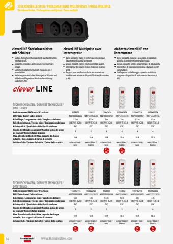 36 WWW.BRENNENSTUHL.COMSTECKDOSENLEISTEN /PROLONGATEURS MULTIPRISES/PRESE MULTIPLESteckdosenleisten / Prolongateurs multiprises/ Prese multipleSTECKDOSENLEISTEN /PROLONGATEURS MULTIPRISES/PRESE MULTIPLESteckdosenleisten / Prolongateurs multiprises/ Prese multiplecleverLINE Steckdosenleiste mit SchaltercleverLINE Multiprise avec interrupteurciabatta cleverLINE con interruttore %u25a0 Stabile, formsch%u00f6ne Kompaktleiste aus hochbruchfestem Kunststoff.%u25a0 Elegantes, schlankes, zeitloses und hochwertiges Design.%u25a0 Sicherheitsschalter beleuchtet, zweipolig ein-/ausschaltbar.%u25a0 Halterung zum einfachen Befestigen an W%u00e4nden und M%u00f6beln mit Magnet und Anschraubvorrichtung (Zubeh%u00f6r S. 40).%u25a0 Barre compacte stable et esth%u00e9tique en plastique hautement r%u00e9sistant %u00e0 la rupture.%u25a0 Design %u00e9l%u00e9gant, %u00e9lanc%u00e9, intemporel et de qualit%u00e9.%u25a0 Interrupteur de s%u00e9curit%u00e9 %u00e9clair%u00e9, bipolaire marche/arr%u00eat.%u25a0 Support pour une fixation facile aux murs et aux meubles avec aimant et dispositif %u00e0 visser (Accessoires p. 40)%u25a0 Barra compatta, robusta e sagomata, realizzata in plastica altamente resistente alla rottura.%u25a0 Design elegante, sottile, senza tempo e di alta qualit%u00e0.%u25a0 Interruttore di sicurezza illuminato, a due poli on/off commutabile.%u25a0 Staffa per un facile fissaggio a pareti e mobili con magnete e dispositivo di avvitamento (Accessori p. 40).TECHNISCHE DATEN / DONN%u00c9ES TECHNIQUES / DATI TECNICIArtikelnummer/ R%u00e9f%u00e9rence / N%u00b0 articolo 1158622 1158612 1159462414 1159462424 1159462714 1159462724EAN/ Code-barre / Codice a Barre 4007123058655 4007123058648 4007123313761 4007123313778 4007123304417 4007123289356Kabell%u00e4nge / Longueur de c%u00e2ble / Lunghezza del cavo 1.5 m 1.5 m 3 m 3 m 1.5 m 1.5 mKabelbezeichnung / Type de c%u00e2ble / Designazione del cavo H05VV-F 3G1,0 H05VV-F 3G1,0 H05VV-F 3G1,0 H05VV-F 3G1,0 H05VV-F 3G1,0 H05VV-F 3G1,0Kabelqualit%u00e4t/ Qualit%u00e9 du c%u00e2ble / Qualit%u00e0 del cavo PVC PVC PVC PVC PVC PVCAnzahl der Steckdosen gesamt/ Nombre global de prises de courant/ Numero totale di prese 3 3 4 4 4 4Max. Strombelastbarkeit/ Max. capacit%u00e9 de charge actuelle / Max. capacit%u00e0 di carico di corrente 10 A 10 A 10 A 10 A 10 A 10 AGeh%u00e4usefarbe / Couleur du bo%u00eetier/ Colore della scatola schwarz/ noir/ neroweiss/ blanc/ biancoschwarz/ noir/ neroweiss/ blanc/ biancoschwarz/ noir/ neroweiss/ blanc/ bianco3m 3mTECHNISCHE DATEN / DONN%u00c9ES TECHNIQUES / DATI TECNICIArtikelnummer/ R%u00e9f%u00e9rence / N%u00b0 articolo 1158002415 1158022425 1158002 1158022 1159462416 1159462326EAN/ Code-barre / Codice a Barre 4007123313808 4007123313815 4007123058624 4007123058631 4007123313822 4007123313839Kabell%u00e4nge / Longueur de c%u00e2ble / Lunghezza del cavo 5 m 5 m 1.5 m 1.5 m 3 m 3 mKabelbezeichnung / Type de c%u00e2ble / Designazione del cavo H05VV-F 3G1,0 H05VV-F 3G1,0 H05VV-F 3G1,0 H05VV-F 3G1,0 H05VV-F 3G1,0 H05VV-F 3G1,0Kabelqualit%u00e4t/ Qualit%u00e9 du c%u00e2ble / Qualit%u00e0 del cavo PVC PVC PVC PVC PVC PVCAnzahl der Steckdosen gesamt/ Nombre global de prises de courant/ Numero totale di prese 5 5 5 5 6 6Max. Strombelastbarkeit/ Max. capacit%u00e9 de charge actuelle / Max. capacit%u00e0 di carico di corrente 10 A 10 A 10 A 10 A 10 A 10 AGeh%u00e4usefarbe / Couleur du bo%u00eetier/ Colore della scatola schwarz/ noir/neroweiss/ blanc/biancoschwarz/ noir/neroweiss/ blanc/biancoschwarz/ noir/neroweiss/ blanc/bianco5m 5m 3m 3m