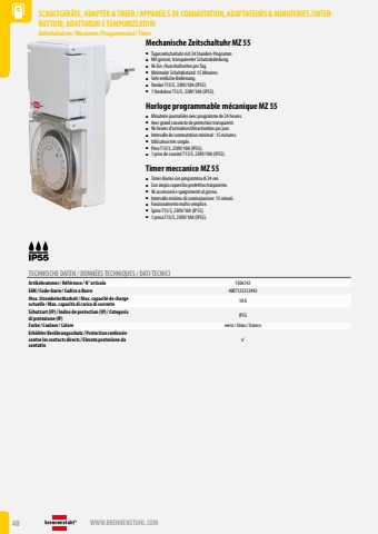 48 WWW.BRENNENSTUHL.COMSCHALTGER%u00c4TE, ADAPTER & TIMER / APPAREILS DE COMMUTATION, ADAPTATEURS & MINUTERIES/INTERRUTTORI, ADATTATORI E TEMPORIZZATORIZeitschaltuhren / Minuteries/ Programmatori / TimerSCHALTGER%u00c4TE, ADAPTER & TIMER / APPAREILS DE COMMUTATION, ADAPTATEURS & MINUTERIES/INTERRUTTORI, ADATTATORI E TEMPORIZZATORIZeitschaltuhren / Minuteries/ Programmatori / TimerMechanische Zeitschaltuhr MZ 55%u25a0 Tageszeitschaltuhr mit 24 Stunden-Programm.%u25a0 Mit grosser, transparenter Schutzabdeckung.%u25a0 96 Ein-/Ausschaltzeiten pro Tag.%u25a0 Minimaler Schaltabstand: 15 Minuten.%u25a0 Sehr einfache Bedienung.%u25a0 Stecker T13/3, 230V/10A (IP55).%u25a0 1 Steckdose T13/3, 230V/10A (IP55).Horloge programmable m%u00e9canique MZ 55%u25a0 Minuterie journali%u00e8re avec programme de 24 heures.%u25a0 Avec grand couvercle de protection transparent.%u25a0 96 heures d%u2019activation/d%u00e9sactivation par jour.%u25a0 Intervalle de commutation minimal%u00a0: 15 minutes.%u25a0 Utilisation tr%u00e8s simple.%u25a0 Prise T13/3, 230V/10A (IP55).%u25a0 1 prise de courant T13/3, 230V/10A (IP55).Timer meccanico MZ 55%u25a0 Timer diurno con programma di 24 ore.%u25a0 Con ampio coperchio protettivo trasparente.%u25a0 96 accensioni e spegnimenti al giorno.%u25a0 Intervallo minimo di commutazione: 15 minuti.%u25a0 Funzionamento molto semplice.%u25a0 Spina T13/3, 230V/10A (IP55).%u25a0 1 presa T13/3, 230V/10A (IP55).TECHNISCHE DATEN / DONN%u00c9ES TECHNIQUES / DATI TECNICIArtikelnummer/ R%u00e9f%u00e9rence / N%u00b0 articolo 1506142EAN/ Code-barre / Codice a Barre 4007123312443Max. Strombelastbarkeit/ Max. capacit%u00e9 de charge actuelle / Max. capacit%u00e0 di carico di corrente 10 ASchutzart (IP)/ Indice de protection (IP)/ Categoria di protezione (IP) IP55Farbe / Couleur/ Colore weiss/ blanc/ biancoErh%u00f6hter Ber%u00fchrungsschutz/ Protection renforc%u00e9e contre les contacts directs/ Elevata protezione da contatto%uf001