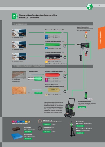 200 mm 36395000 450 mm 36391000450 mm, %u00d8 41-161 mmD 200 mm, %u00d8 82-202 mmE 420 mm, %u00d8 52-202 mmH 300 mm, %u00d8 12-31 mmI 420 mm, %u00d8 38-51 mmPowerLineD E H I J QQJ3545000035910000 35652000359130000964600003E3500035812000200 mm 36395000450 mm 36391000350 mm 36394000R 350 mm, %u00d8 68-182 mmDiamant-Bohrkronen Multi-Material TIMBER-PRO 1%u00bc\R450 mm, %u00d8 42-300 mmF%u00dcR TROCKENBOHRUNGEN MIT STAUBABSAUGUNGF%u00dcR NASSBOHRUNGENDiamant-Nass-Bohrkronen R%u00bd\MaterialZentrierstange Diamant-Trocken-Bohrkronen 1%u00bc\Materialf%u00fcr Mauerwerk,KalksandsteinDiamant-Nass-Bohrkronen 1%u00bc\Diamant-Nass-Bohrkronen 1%u00bc\f%u00fcr armierten BetonDiamant-KernbohreinheitDBE 162 (siehe Seite 45)f%u00fcr armierten Betonf%u00fcr armierten BetonWasserdruckbeh%u00e4lter10 l Metall, inkl. 3,5 m Schlauchmit Gardena-AnschlussDiamant-Nass-Trocken-KernbohrmaschineETN 162/3 %u2013 ZUBEH%u00d6RBohrst%u00e4nderBST 182 V/S (siehe Seite 57)Sch%u00e4rfstein200 x 100 x 50 mmLeichtl%u00f6sering 1%u00bc\f%u00fcr Bohrkronen1 St%u00fcckKupferring 1%u00bc\zum leichten L%u00f6sen der Bohrkrone1 St%u00fcck Bohrkronen siehe Seite 60ZSch%u00e4rfplatte320 x 320 x 55 mmGesundheitsgef%u00e4hrdende St%u00e4ube (z.B. Quarzstaub) m%u00fcssen von einem Entstauber mit Staubklasse M-Zulassung abgesaugt werden! Wir empfehlen f%u00fcr unsere Elektrowerkzeuge einen M-Sauger aus der EIBENSTOCK ESS/DSS-Reihe.(ab %u00d8 80 mm Bohrst%u00e4nder erforderlich)DIAMANT-KERNBOHRENDurchfl ussanzeigerdas rotierende Fl%u00fcgelrad zeigt den Wasserdurchfluss anHolz33