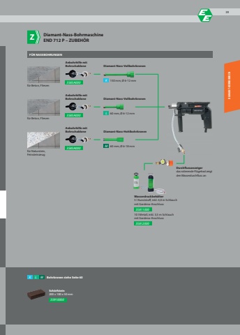 3583A0003583A0003583A000150 mm, %u00d8 6-12 mm60 mm, %u00d8 6-12 mm60 mm, %u00d8 6-18 mm359100003581200035811000K L MMLKDiamant-Nass-VollbohrkronenDiamant-Nass-Hohlbohrkronenf%u00fcr Beton, Fliesenf%u00fcr Naturstein,FeinsteinzeugMaterialf%u00fcr Beton, FliesenAnbohrhilfe mit BohrschabloneAnbohrhilfe mit BohrschabloneDiamant-Nass-VollbohrkronenAnbohrhilfe mit BohrschabloneWasserdruckbeh%u00e4lter5 l Kunststoff , inkl. 4,0 m Schlauchmit Gardena-Anschluss 10 l Metall, inkl. 3,5 m Schlauchmit Gardena-AnschlussF%u00dcR NASSBOHRUNGENBohrkronen siehe Seite 60Sch%u00e4rfstein200 x 100 x 50 mmZDIAMANT-KERNBOHRENDurchfl ussanzeigerdas rotierende Fl%u00fcgelrad zeigt den Wasserdurchfluss anDiamant-Nass-BohrmaschineEND 712 P %u2013 ZUBEH%u00d6R39