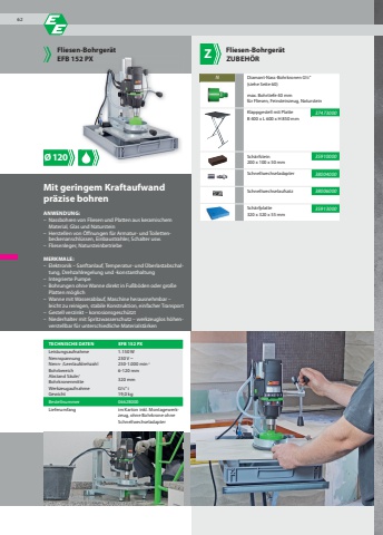 3747300035910000380040003800600035913000320 x 320 x 55 mm%u00d8120Fliesen-Bohrger%u00e4t Z ZUBEH%u00d6RMit geringem Kraftaufwandpr%u00e4zise bohrenANWENDUNG:%u2013 Nassbohren von Fliesen und Platten aus keramischem Material, Glas und Naturstein%u2013 Herstellen von %u00d6ffnungen f%u00fcr Armatur- und Toilettenbeckenanschl%u00fcssen, Einbaustrahler, Schalter usw.%u2013 Fliesenleger, NatursteinbetriebeMERKMALE:%u2013 Elektronik %u2013 Sanftanlauf, Temperatur- und %u00dcberlastabschaltung, Drehzahlregelung und -konstanthaltung%u2013 Integrierte Pumpe%u2013 Bohrungen ohne Wanne direkt in Fu%u00dfb%u00f6den oder gro%u00dfe Platten m%u00f6glich%u2013 Wanne mit Wasserablauf, Maschine herausnehmbar %u2013 leicht zu reinigen, stabile Konstruktion, einfacher Transport%u2013 Gestell verzinkt %u2013 korrosionsgesch%u00fctzt%u2013 Niederhalter mit Spritzwasserschutz %u2013 werkzeuglos h%u00f6henverstellbar f%u00fcr unterschiedliche Materialst%u00e4rkenFliesen-Bohrger%u00e4tEFB 152 PXTECHNISCHE DATEN EFB 152 PXLeistungsaufnahme 1.150 WNennspannung 230 V ~Nenn- /Leerlaufdrehzahl 250-1.000 min-1Bohrbereich 6-120 mmAbstand S%u00e4ule/Bohrkronenmitte 320 mmWerkzeugaufnahme G%u00bd\Gewicht 19,0 kg Bestellnummer 0662B000Lieferumfang im Karton inkl. Montagewerkzeug, ohne Bohrkrone ohne SchnellwechseladapterDiamant-Nass-Bohrkronen G%u00bd%u201c(siehe Seite 60)max. Bohrtiefe 40 mmf%u00fcr Fliesen, Feinsteinzeug, NatursteinKlappgestell mit PlatteB 400 x L 600 x H 850 mmSch%u00e4rfstein200 x 100 x 50 mmSchnellwechseladapterSchnellwechselaufsatzSch%u00e4rfplatte62N