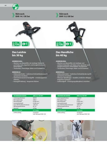 120 1 120 1 max. max.Das Handliche bis 40 kgANWENDUNG:%u2013 Mischen von Baustoffen mit niedriger und mittlerer Viskosit%u00e4t, z.B. Farbe, Leim, Spachtel- und Ausgleichsmassen, Fliesenkleber, Fertigm%u00f6rtel%u2013 Trockenbau, Fliesenleger, Maler und StuckateureMERKMALE:%u2013 Elektronikschalter %u2013 stufenlose Drehzahl%u00e4nderung f%u00fcr spritzarmes Anr%u00fchren%u2013 Platzspar-Metallb%u00fcgel %u2013 handlich, einfaches Ablegen, bequemer Transport%u2013 Softhandgriff %u2013 schwingungsd%u00e4mpfend, rutschfestDas Leichtebis 30 kgANWENDUNG:%u2013 Mischen von Baustoffen mit niedriger Viskosit%u00e4t, z.B. Farbe, Leim, Spachtel- und Ausgleichsmassen, Fliesenkleber%u2013 Trockenbau, Fliesenleger, Maler und StuckateureMERKMALE:%u2013 Elektronikschalter %u2013 stufenlose Drehzahl%u00e4nderung f%u00fcr spritzarmes Anr%u00fchren%u2013 Gro%u00df dimensionierte Handgriffe %u2013 erm%u00fcdungsarmes Arbeiten%u2013 Kreuzgriff-Haltung %u2013 bequemes R%u00fchrenTECHNISCHE DATEN EHR 14.1 SK SETLeistungsaufnahme 960 WNennspannung 230 V ~Nenndrehzahl 0-390 min-1Leerlaufdrehzahl 0-590 min-1max. R%u00fchrkorbdurchmesser 120 mmWerkzeugaufnahme M 14 iGewicht 2,9 kgBestellnummer 07753000Lieferumfang im Kartoninkl. R%u00fchrquirl WG 120R%u00fchrwerkEHR 14.1 SK SetR%u00fchrwerkEHR 15.2 SB SetTECHNISCHE DATEN EHR 15.2 SB SETLeistungsaufnahme 1.050 WNennspannung 230 V ~Nenndrehzahl 0-450 min-1Leerlaufdrehzahl 0-800 min-1max. R%u00fchrkorbdurchmesser 120 mmWerkzeugaufnahme M 14 iGewicht 3,1 kgBestellnummer 077E5000Lieferumfang im Kartoninkl. R%u00fchrquirl WG 12068