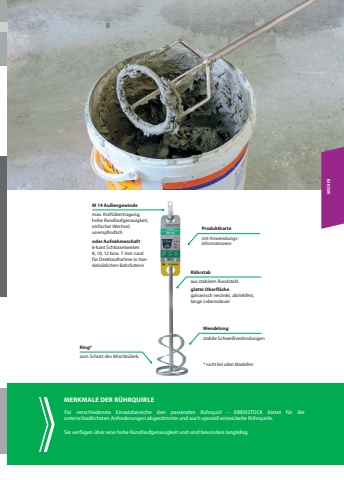 F%u00fcr verschiedenste Einsatzbereiche den passenden R%u00fchrquirl %u2013 EIBENSTOCK bietet f%u00fcr die unterschiedlichsten Anforderungen abgestimmte und auch speziell entwickelte R%u00fchrquirle.Sie verf%u00fcgen %u00fcber eine hohe Rundlaufgenauigkeit und sind besonders langlebig.MERKMALE DER R%u00dcHRQUIRLEWendelungstabile Schwei%u00dfverbindungenM 14 Au%u00dfengewindemax. Kraft%u00fcbertragung,hohe Rundlaufgenauigkeit,einfacher Wechsel,unempfindlichR%u00fchrstabaus stabilem RundstahlRing*zum Schutz des Mischk%u00fcbelsglatte Oberfl%u00e4chegalvanisch verzinkt, abriebfest,lange LebensdauerProduktkartemit Anwendungsinformationen oder Aufnahmeschaft6-kant Schl%u00fcsselweiten8, 10, 12 bzw. 7 mm rundf%u00fcr Direktaufnahme in handels%u00fcblichen Bohrfuttern* nicht bei allen ModellenMISCHEN