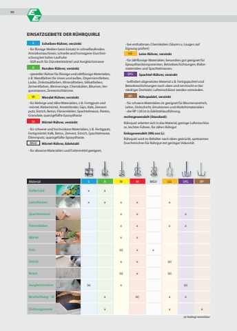 WRSMGVLGSPGRPM(x) bedingt einsetzbarMaterial S R W M MGV LG SPG RPFarbe/Lack x xLeim/Kleister x x x x xSpachtelmasse x x xFliesenkleber x x x xM%u00f6rtel x xPutz (x) x xEstrich x x (x)Beton (x) x (x)Ausgleichsmasse (x) x (x)Beschichtung - 2K x (x) x xDichtungsmasse x x xEINSATZGEBIETE DER R%u00dcHRQUIRLEScheiben-R%u00fchrer, verzinkt- f%u00fcr fl %u00fcssige Medien beim Einsatz in schnelllaufenden Antriebsmaschinen; schnelle und homogene Durchmischung bei hoher Laufruhe- SGR auch f%u00fcr D%u00fcnnbettm%u00f6rtel und AusgleichsmasseRonden-R%u00fchrer, verzinkt- spezieller R%u00fchrer f%u00fcr fl %u00fcssige und z%u00e4hfl %u00fcssige Materialien, z.B. Wandfarben f%u00fcr innen und au%u00dfen, Dispersionsfarben, Lacke, Zinkstaubfarben, Mineralfarben, Silikatfarben, Zementfarben, Bleimennige, Chemikalien, Bitumen, Vergussmassen, Zementschl%u00e4mme.Wendel-R%u00fchrer, verzinkt- f%u00fcr klebrige und z%u00e4he Materialien, z.B. Fertigputz und -m%u00f6rtel, Klebem%u00f6rtel, Ansetzbinder, Gips, Kalk, Zementputz, Estrich, Beton, Fliesenkleber, Spachtelmasse, Pasten, Granulate, quarzgef%u00fcllte EpoxydharzeM%u00f6rtel-R%u00fchrer, verzinkt- f%u00fcr schwere und hochviskose Materialien, z.B. Fertigputz, Fertigm%u00f6rtel, Kalk, Beton, Zement, Estrich, Spachtelmasse, D%u00e4mmputz, quarzgef%u00fcllte Epoxydharze.M%u00f6rtel-R%u00fchrer, Edelstahl- f%u00fcr abrasive Materialien und Futtermittel geeignet, - bei enthaltenen Chemikalien (S%u00e4uren u. Laugen auf Eignung pr%u00fcfen!)Leim-R%u00fchrer, verzinkt- f%u00fcr z%u00e4hfl %u00fcssige Materialien; besonders gut geeignet f%u00fcr Epoxydharzkomponenten, Betonbeschichtungen, Klebematerialien und Spachtelmassen.Spachtel-R%u00fchrer, verzinkt- bef%u00f6rdert abgesetztes Material z.B. Fertigspachtel und Betonbeschichtungen nach oben und vermischt es bei niedriger Drehzahl. Lufteinschl%u00fcsse werden vermieden.R%u00fchrpaddel, verzinkt- f%u00fcr schwere Materialien ist geeignet f%u00fcr Bitumenanstrich, Lehm, Dickschicht, Emulsionen und Abdichtmaterialien- der RP 120 ist in Edelstahlausf%u00fchrung.rechtsgewendelt (Standard):R%u00fchrquirl arbeitet sich in das Material, geringe Lufteinschl%u00fcsse, leichtes F%u00fchren, f%u00fcr z%u00e4hes R%u00fchrgutlinksgewendelt (MG xxx L):R%u00fchrquirl wird im Beh%u00e4lter nach oben gedr%u00fcckt, spritzarmes Durchmischen f%u00fcr R%u00fchrgut mit geringer Viskosit%u00e4t80