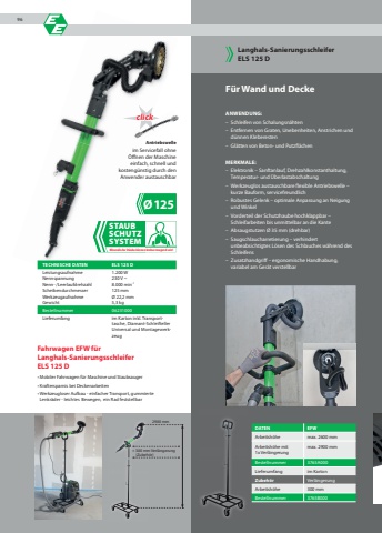 %u00d8125clickLanghals-SanierungsschleiferELS 125 DF%u00fcr Wand und DeckeANWENDUNG:%u2013 Schleifen von Schalungsn%u00e4hten%u2013 Entfernen von Graten, Unebenheiten, Anstrichen und d%u00fcnnen Kleberesten%u2013 Gl%u00e4tten von Beton- und Putzfl%u00e4chenMERKMALE:%u2013 Elektronik %u2013 Sanftanlauf, Drehzahlkonstanthaltung, Temperatur- und %u00dcberlastabschaltung%u2013 Werkzeuglos austauschbare flexible Antriebswelle %u2013 kurze Bauform, servicefreundlich%u2013 Robustes Gelenk %u2013 optimale Anpassung an Neigung und Winkel%u2013 Vorderteil der Schutzhaube hochklappbar %u2013 Schleifarbeiten bis unmittelbar an die Kante%u2013 Absaugstutzen %u00d8 35 mm (drehbar)%u2013 Saugschlaucharretierung %u2013 verhindert unbeabsichtigtes L%u00f6sen des Schlauches w%u00e4hrend des Schleifens%u2013 Zusatzhandgriff %u2013 ergonomische Handhabung, variabel am Ger%u00e4t verstellbarDATEN EFWArbeitsh%u00f6he max. 2600 mmArbeitsh%u00f6he mit1x Verl%u00e4ngerungmax. 2900 mmBestellnummer 3765A000Lieferumfang im KartonZubeh%u00f6r Verl%u00e4ngerungArbeitsh%u00f6he 300 mmBestellnummer 3765B0002900 mm+ 300 mm Verl%u00e4ngerung  (Zubeh%u00f6r)Antriebswelleim Servicefall ohne %u00d6ffnen der Maschine einfach, schnell und kosteng%u00fcnstig durch den Anwender austauschbarSTAUBSCHUTZSYSTEMMineralische St%u00e4ube k%u00f6nnen krebserzeugend sein!Fahrwagen EFW f%u00fcr Langhals-SanierungsschleiferELS 125 D%u2022 Mobiler Fahrwagen f%u00fcr Maschine und Staubsauger%u2022 Kraftersparnis bei Deckenarbeiten%u2022 Werkzeugloser Aufbau - einfacher Transport, gummierte  Lenkr%u00e4der - leichtes Bewegen, ein Rad feststellbarTECHNISCHE DATEN ELS 125 DLeistungsaufnahme 1.200 WNennspannung 230 V ~Nenn- /Leerlaufdrehzahl 8.000 min-1Scheibendurchmesser 125 mmWerkzeugaufnahme %u00d8 22,2 mmGewicht 5,3 kgBestellnummer 06231000Lieferumfang im Karton inkl. Transporttasche, Diamant-Schleifteller Universal und Montagewerkzeug96