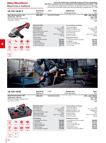 Technische %u00c4nderungen. Preis%u00e4nderungen und Irrtum vorbehalten.Alle Preise verstehen sich als unverbindliche Preisempfehlung exkl. MwSt + vRGSous r%u00e9serve de modifications techniques, de changements de prix et d%u2019erreurs. Tous les prix s%u2018entendent comme prix recommand%u00e9s sans engagement, HT + TAR41Schweizer SpezialistenSp%u00e9cialistes suissesTechnische DatenLeistungsaufnahme1600 WLeerlaufdrehzahl2%u2018000 1/minKabell%u00e4nge4.0 mGewicht9.30 kgLieferumfang1x Gewindereduktion51.1911x R%u00fchrstab inkl. Schraubenset51.2171x R%u00fchrpropeller INOX %u00d8 150 mm51.2131x Seitlicher Handgriff M14193.3561x Gabelschl%u00fcssel, SW 22109.398Caract%u00e9ristiques techniquesPuissance absorb%u00e9e1600 WVitesse de rotation %u00e0 vide2%u2018000 tr/minLongueur de c%u00e2ble4.0 mPoids9.30 kgEquipement de base1x r%u00e9duction de filetage51.1911x b%u00e2ton d%u2018agitation avec kit de vis51.2171x h%u00e9lice m%u00e9langeuse INOX %u00d8 150 mm51.2131x poign%u00e9e lat%u00e9rale M14193.3561x cl%u00e9 %u00e0 fourche, SW 22109.398R 2602Bestell-Nr.R%u00e9f%u00e9renceGTINRabattcodeCode de remisePreisPrix1600 Watt R%u00fchrmaschineM%u00e9langeur 1600 Watt50.196403029301248611%u2018040.%u2013 exkl. MwSt. hors TVA 2.31 vRGTARTechnische DatenLeistungsaufnahme1200 WLeerlaufdrehzahl4%u2018000 1/minWerkzeugdurchmesser100 mmAbsaugstutzendurchmesser32 mmKabell%u00e4nge4.0 mGewicht4.40 kgLieferumfang1x Stockvorsatz inkl.3 Stockstationen51.0131x B%u00fcgelgriff236.9341x Adapter445.1421x Transportkoffer L-BOXX%u00ae414.093Caract%u00e9ristiques techniquesPuissance absorb%u00e9e1200 WVitesse de rotation %u00e0 vide4%u2018000 tr/minDiam%u00e8tre outil max.100 mmRaccord de l%u2018aspiration de poussi%u00e8re32 mmLongueur de c%u00e2ble4.0 mPoids4.40 kgEquipement de base1x canne de rechange avec3 stations de canne51.0131x poign%u00e9e %u00e0 %u00e9trier236.9341x adaptateur445.1421x coffret de transport L-BOXX%u00ae414.093ST 1503Bestell-Nr.R%u00e9f%u00e9renceGTINRabattcodeCode de remisePreisPrix1200 Watt StockmaschineBouchardeuse 1200 Watt50.186403029300156511%u2018400.%u2013 exkl. MwSt. hors TVA 0.56 vRGTARTechnische DatenLeistungsaufnahme1800 WLeerlaufdrehzahl4%u2018000 1/minWerkzeugdurchmesser150 mmAbsaugstutzendurchmesser32 mmKabell%u00e4nge4.0 mGewicht6.95 kgLieferumfang1x Stockvorsatz inkl.4 Stockstationen51.0111x B%u00fcgelhandgriff1x Adapter461.6361x Transportkoffer444.391Caract%u00e9ristiques techniquesPuissance absorb%u00e9e1800 WVitesse de rotation %u00e0 vide4%u2018000 tr/minDiam%u00e8tre outil max.150 mmRaccord de l%u2018aspiration de poussi%u00e8re32 mmLongueur de c%u00e2ble4.0 mPoids6.95 kgEquipement de base1x canne de rechange avec4 stations de canne51.0111x poign%u00e9e %u00e0 %u00e9trier1x adaptateur461.6361x coffret de transport444.391ST 804Bestell-Nr.R%u00e9f%u00e9renceGTINRabattcodeCode de remisePreisPrix1800 Watt StockmaschineBouchardeuse 1800 Watt50.192403029301003111%u2018835.%u2013 exkl. MwSt. hors TVA 2.31 vRGTAR