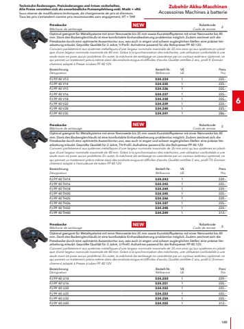 Technische %u00c4nderungen. Preis%u00e4nderungen und Irrtum vorbehalten.Alle Preise verstehen sich als unverbindliche Preisempfehlung exkl. MwSt + vRGSous r%u00e9serve de modifications techniques, de changements de prix et d%u2019erreurs. Tous les prix s%u2018entendent comme prix recommand%u00e9s sans engagement, HT + TAR536Akku-MaschinenMachines %u00e0 batterieTechnische DatenAkku-Spannung12VAkku-Kapazit%u00e4t2.5 / 5.0 AhLeerlaufhubzahl800 %u2013 3%u2018000 1/minHub23 mmPedelhubstufen4 StufenDrehzahlstufen1-5 +A StufenSchwenkbereich0-45%u00b0Max. Materialst%u00e4rke Holz90 mmMax. Materialst%u00e4rke Metall10 mmAbmessung LxBxH220 x 69 x 183 mmGewicht ohne Akkupack1.46 kgCaract%u00e9ristiques techniquesTension de batterie12VCapacit%u00e9 de batterie2.5 / 5.0 AhVitesse de cycle %u00e0 vide800 %u2013 3%u2018000 tr/minCourse23 mmNiveaux de mouvement pendulaire4 niveauxNiveaux de vitesse1-5 +A nixeauxPlage de pivotement0-45%u00b0%u00c9paisseur de mat%u00e9riau max. bois90 mm%u00c9paisseur de mat%u00e9riau max. m%u00e9tal10 mmDimension LxlxH220x69x183mmPoids sans batterie1.46 kgJSP 12-EC CBestell-Nr.R%u00e9f%u00e9renceGTINRabattcodeCode de remisePreisPrixAkku-Stichs%u00e4ge 12V Scie sauteuse %u00e0 batterie 12V531.31640302932515641190.%u2013 exkl. MwSt. hors TVA 0.56 vRGTARNEWLieferumfang1x Spanflugschutz geschlossen1x Spannreissschutz490.2291x Saugadapter %u00d8 271x Innensechskantschl%u00fcssel, SW 31x GleitschuhEquipement de base1x protection contre la projection de copeaux ferm%u00e9e1x protection contre les %u00e9clats490.2291x adaptateur d%u2018aspiraton %u00d8 271x cl%u00e9 allen, SW 31x patin coulissantTechnische DatenAkku-Spannung12VAkku-Kapazit%u00e4t2.5 / 5.0 AhLeerlaufdrehzahl0 %u2013 810 1/minLeerlaufschlagzahl0 %u2013 4%u2018500 1/minMax. Einzelschlagenergie1.5 JMax. Bohrdurchmesser Beton16 mmWerkzeugaufnahmeSDS-plusAbmessung LxBxH263 x 68 x 190 mmGewicht ohne Akkupack1.68 kgCaract%u00e9ristiques techniquesTension de batterie12VCapacit%u00e9 de batterie2.5 / 5.0 AhVitesse de rotation %u00e0 vide0 %u2013 810 tr/minNombre de coups %u00e0 vide0 %u2013 4%u2018500 tr/minForce de frappe max.1.5 JDiam%u00e8tre de per%u00e7age max. b%u00e9ton16 mmEmmanchementSDS-plusDimension LxlxH263x68x190mmPoids sans batterie1.68 kgFHE 1-16 12-ECBestell-Nr.R%u00e9f%u00e9renceGTINRabattcodeCode de remisePreisPrixKompakter und leistungsstarkerAkku-Bohrhammer 12V Marteau perforateur %u00e0 batterie12Vcompact et puissant531.71040302932555001275.%u2013 exkl. MwSt. hors TVA 0.56 vRGTARNEWLieferumfang1x Koffereinlage533.1701x Transportkoffer L-BOXX%u00ae414.085Equipement de base1x insert pour coffret533.1701x coffret de transport L-BOXX%u00ae414.085Das passende Zubeh%u00f6r finden Sie ab der Seite 219.Vous trouverez les accessoires correspondants %u00e0 partir de la page 219.