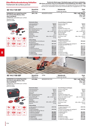Technische %u00c4nderungen. Preis%u00e4nderungen und Irrtum vorbehalten.Alle Preise verstehen sich als unverbindliche Preisempfehlung exkl. MwSt + vRGSous r%u00e9serve de modifications techniques, de changements de prix et d%u2019erreurs. Tous les prix s%u2018entendent comme prix recommand%u00e9s sans engagement, HT + TAR10WinkelschleiferMeuleses d%u2018angle2Technische DatenLeistungsaufnahme900 WLeistungsabgabe600 WSpannung230 VFrequenz50/60 HzMax. Scheibendurchmesser125 mmLeerlaufdrehzahl11%u2018500 1/minWerkzeugaufnahmeM14Kabell%u00e4nge4.0 mAbmessung LxBxH300 x 75 x 105 mmGewicht2.0 kgLieferumfang1x Schutzhaube Schleifen436.8601x Spannflansch335.2821x Spannmutter M14100.0801x Stirnlochschl%u00fcssel, BL 5100.1101x Handgriff450.774Caract%u00e9ristiques techniquesPuissance absorb%u00e9e900 WPuissance utile600 WTension230 VFr%u00e9quence50/60 HzDiam%u00e8tre de disque max.125 mmVitesse de rotation %u00e0 vide11%u2018500 tr/minEmmanchementM14Longueur de c%u00e2ble4.0 mDimension LxlxH300 x 75 x 105 mmPoids2.0 kgEquipement de base1x carter de protection du pon%u00e7age436.8601x bride de serrage335.2821x ecrou de serrage M14100.0801x cl%u00e9 %u00e0 ergots, BL 5100.1101x poign%u00e9e450.774L 9-11 125Bestell-Nr.R%u00e9f%u00e9renceGTINRabattcodeCode de remisePreisPrix900 Watt Winkelschleifer, 125 mmMeuleuse d%u2018angle 900 Watt, 125 mm492.53140302932228921140.%u2013 exkl. MwSt. hors TVA 0.56 vRGTARTechnische DatenLeistungsaufnahme900 WLeistungsabgabe600 WSpannung230 VFrequenz50/60 HzMax. Scheibendurchmesser125 mmLeerlaufdrehzahl6%u2018000 %u2013 11%u2018500 1/minWerkzeugaufnahmeM14Kabell%u00e4nge4.0 mAbmessung LxBxH300 x 75 x 105 mmGewicht2.0 kgLieferumfang1x Schutzhaube Schleifen436.8601x Spannflansch335.2821x Spannmutter M14100.0801x Stirnlochschl%u00fcssel, BL 5100.1101x Handgriff450.774Caract%u00e9ristiques techniquesPuissance absorb%u00e9e900 WPuissance utile600 WTension230 VFr%u00e9quence50/60 HzDiam%u00e8tre de disque max.125 mmVitesse de rotation %u00e0 vide11%u2018500 tr/minEmmanchementM14Longueur de c%u00e2ble4.0 mDimension LxlxH300 x 75 x 105 mmPoids2.0 kgEquipement de base1x carter de protection du pon%u00e7age436.8601x bride de serrage335.2821x ecrou de serrage M14100.0801x cl%u00e9 %u00e0 ergots, BL 5100.1101x poign%u00e9e450.774LE 9-11 125Bestell-Nr.R%u00e9f%u00e9renceGTINRabattcodeCode de remisePreisPrix900 Watt Winkelschleifer mit variabler Drehzahl, 125 mmMeuleuse d%u2018angle 900 Watt,usage universel, 125 mm436.29140302931891331165.%u2013 exkl. MwSt. hors TVA 0.56 vRGTARTechnische DatenLeistungsaufnahme900 WLeistungsabgabe600 WSpannung230 VFrequenz50/60 HzMax. Scheibendurchmesser125 mmLeerlaufdrehzahl11%u2018500 1/minWerkzeugaufnahmeM14Kabell%u00e4nge4.0 mAbmessung LxBxH300 x 75 x 105 mmGewicht2.0 kgLieferumfang1x Schutzhaube Schleifen436.8601x Spannflansch335.2821x Spannmutter M14100.0801x Stirnlochschl%u00fcssel, BL 5100.1101x Handgriff450.7741x Koffereinlage414.2041x Transportkoffer L-BOXX%u00ae414.085Caract%u00e9ristiques techniquesPuissance absorb%u00e9e900 WPuissance utile600 WTension230 VFr%u00e9quence50/60 HzDiam%u00e8tre de disque max.125 mmVitesse de rotation %u00e0 vide11%u2018500 tr/minEmmanchementM14Longueur de c%u00e2ble4.0 mDimension LxlxH300 x 75 x 105 mmPoids2.0 kgEquipement de base1x carter de protection du pon%u00e7age436.8601x bride de serrage335.2821x ecrou de serrage M14100.0801x cl%u00e9 %u00e0 ergots, BL 5100.1101x poign%u00e9e450.7741x insert pour coffret414.2041x coffret de transport L-BOXX%u00ae414.085LE 9-11 125 L-BOXXBestell-Nr.R%u00e9f%u00e9renceGTINRabattcodeCode de remisePreisPrix900 Watt Winkelschleifer mit variabler Drehzahl, 125 mmMeuleuse d%u2018angle 900 Watt,usage universel, 125 mm436.73940302931895081215.%u2013 exkl. MwSt. hors TVA 0.56 vRGTAR