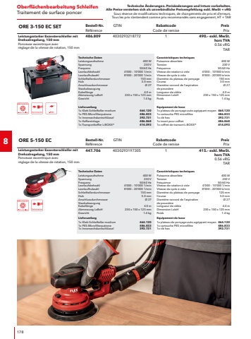 Technische %u00c4nderungen. Preis%u00e4nderungen und Irrtum vorbehalten.Alle Preise verstehen sich als unverbindliche Preisempfehlung exkl. MwSt + vRGSous r%u00e9serve de modifications techniques, de changements de prix et d%u2019erreurs. Tous les prix s%u2018entendent comme prix recommand%u00e9s sans engagement, HT + TAR14WinkelschleiferMeuleses d%u2018angle2Technische DatenLeistungsaufnahme2600 WLeistungsabgabe1800 WSpannung230 VFrequenz50/60 HzMax. Scheibendurchmesser230 mmLeerlaufdrehzahl6%u2018500 1/minWerkzeugaufnahmeM14Kabell%u00e4nge4.0 mAbmessung LxBxH500 x 106 x 145 mmGewicht6.35 kgLieferumfang1x Schutzhaube Schleifen442.8281x SoftVib-Handgriff325.3841x Schnellspannmutter M14530.7261x Innensechskantschl%u00fcssel, SW 6104.1671x Spannflansch335.282Caract%u00e9ristiques techniquesPuissance absorb%u00e9e2600 WPuissance utile1800 WTension230 VFr%u00e9quence50/60 HzDiam%u00e8tre de disque max.230 mmVitesse de rotation %u00e0 vide6%u2018500 tr/minEmmanchementM14Longueur de c%u00e2ble4.0 mDimension LxlxH500 x 106 x 145 mmPoids6.35 kgEquipement de base1x carter de protection du pon%u00e7age442.8281x poign%u00e9e SoftVib325.3841x ecro de serrage rapide530.7261x cl%u00e9 hex, SW 6104.1671x bride de serrage335.282L 26-6 230Bestell-Nr.R%u00e9f%u00e9renceGTINRabattcodeCode de remisePreisPrix2600 Watt Winkelschleifer, 230 mmMeuleuse d%u2018angle 2600 Watt, 230 mm531.04540302932488541375.%u2013 exkl. MwSt. hors TVA 2.31 vRGTARTechnische DatenLeistungsaufnahme2100 WLeistungsabgabe1250 WSpannung230 VFrequenz50/60 HzMax. Scheibendurchmesser230 mmLeerlaufdrehzahl6%u2018500 1/minWerkzeugaufnahmeM14Kabell%u00e4nge4.0 mAbmessung LxBxH490 x 104 x 90 mmGewicht5.4 kgLieferumfang1x Schutzhaube Schleifen338.7291x SoftVib-Handgriff325.3841x Spannflansch335.2821x Spannmutter M14100.0801x Stirnlochschl%u00fcssel, BL 5100.110Caract%u00e9ristiques techniquesPuissance absorb%u00e9e2100 WPuissance utile1250 WTension230 VFr%u00e9quence50/60 HzDiam%u00e8tre de disque max.230 mmVitesse de rotation %u00e0 vide6%u2018500 tr/minEmmanchementM14Longueur de c%u00e2ble4.0 mDimension LxlxH490 x 104 x 90 mmPoids5.4 kgEquipement de base1x carter de protection du pon%u00e7age338.7291x poign%u00e9e SoftVib325.3841x bride de serrage335.2821x ecrou de serrage M14100.0801x cl%u00e9 %u00e0 ergots, BL 5100.110L 21-6 230Bestell-Nr.R%u00e9f%u00e9renceGTINRabattcodeCode de remisePreisPrix2100 Watt Winkelschleifer, 230 mmMeuleuse d%u2018angle 2100 Watt, 230 mm391.51440302931643071250.%u2013 exkl. MwSt. hors TVA 2.31 vRGTAR