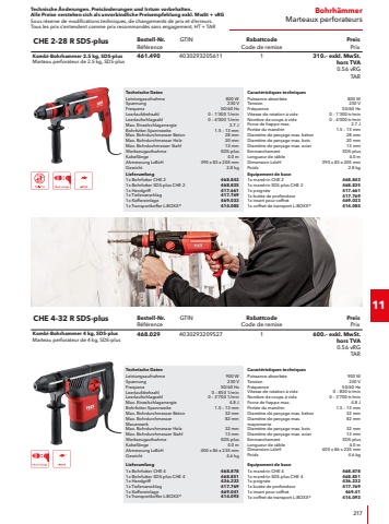 Technische %u00c4nderungen. Preis%u00e4nderungen und Irrtum vorbehalten.Alle Preise verstehen sich als unverbindliche Preisempfehlung exkl. MwSt + vRGSous r%u00e9serve de modifications techniques, de changements de prix et d%u2019erreurs. Tous les prix s%u2018entendent comme prix recommand%u00e9s sans engagement, HT + TAR536Akku-MaschinenMachines %u00e0 batterieTechnische DatenAkku-Spannung12VAkku-Kapazit%u00e4t2.5 / 5.0 AhLeerlaufhubzahl800 %u2013 3%u2018000 1/minHub23 mmPedelhubstufen4 StufenDrehzahlstufen1-5 +A StufenSchwenkbereich0-45%u00b0Max. Materialst%u00e4rke Holz90 mmMax. Materialst%u00e4rke Metall10 mmAbmessung LxBxH220 x 69 x 183 mmGewicht ohne Akkupack1.46 kgCaract%u00e9ristiques techniquesTension de batterie12VCapacit%u00e9 de batterie2.5 / 5.0 AhVitesse de cycle %u00e0 vide800 %u2013 3%u2018000 tr/minCourse23 mmNiveaux de mouvement pendulaire4 niveauxNiveaux de vitesse1-5 +A nixeauxPlage de pivotement0-45%u00b0%u00c9paisseur de mat%u00e9riau max. bois90 mm%u00c9paisseur de mat%u00e9riau max. m%u00e9tal10 mmDimension LxlxH220x69x183mmPoids sans batterie1.46 kgJSP 12-EC CBestell-Nr.R%u00e9f%u00e9renceGTINRabattcodeCode de remisePreisPrixAkku-Stichs%u00e4ge 12V Scie sauteuse %u00e0 batterie 12V531.31640302932515641190.%u2013 exkl. MwSt. hors TVA 0.56 vRGTARNEWLieferumfang1x Spanflugschutz geschlossen1x Spannreissschutz490.2291x Saugadapter %u00d8 271x Innensechskantschl%u00fcssel, SW 31x GleitschuhEquipement de base1x protection contre la projection de copeaux ferm%u00e9e1x protection contre les %u00e9clats490.2291x adaptateur d%u2018aspiraton %u00d8 271x cl%u00e9 allen, SW 31x patin coulissantTechnische DatenAkku-Spannung12VAkku-Kapazit%u00e4t2.5 / 5.0 AhLeerlaufdrehzahl0 %u2013 810 1/minLeerlaufschlagzahl0 %u2013 4%u2018500 1/minMax. Einzelschlagenergie1.5 JMax. Bohrdurchmesser Beton16 mmWerkzeugaufnahmeSDS-plusAbmessung LxBxH263 x 68 x 190 mmGewicht ohne Akkupack1.68 kgCaract%u00e9ristiques techniquesTension de batterie12VCapacit%u00e9 de batterie2.5 / 5.0 AhVitesse de rotation %u00e0 vide0 %u2013 810 tr/minNombre de coups %u00e0 vide0 %u2013 4%u2018500 tr/minForce de frappe max.1.5 JDiam%u00e8tre de per%u00e7age max. b%u00e9ton16 mmEmmanchementSDS-plusDimension LxlxH263x68x190mmPoids sans batterie1.68 kgFHE 1-16 12-ECBestell-Nr.R%u00e9f%u00e9renceGTINRabattcodeCode de remisePreisPrixKompakter und leistungsstarkerAkku-Bohrhammer 12V Marteau perforateur %u00e0 batterie12Vcompact et puissant531.71040302932555001275.%u2013 exkl. MwSt. hors TVA 0.56 vRGTARNEWLieferumfang1x Koffereinlage533.1701x Transportkoffer L-BOXX%u00ae414.085Equipement de base1x insert pour coffret533.1701x coffret de transport L-BOXX%u00ae414.085Das passende Zubeh%u00f6r finden Sie ab der Seite 219.Vous trouverez les accessoires correspondants %u00e0 partir de la page 219.