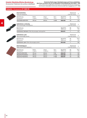 Technische %u00c4nderungen. Preis%u00e4nderungen und Irrtum vorbehalten.Alle Preise verstehen sich als unverbindliche Preisempfehlung exkl. MwSt + vRGSous r%u00e9serve de modifications techniques, de changements de prix et d%u2019erreurs. Tous les prix s%u2018entendent comme prix recommand%u00e9s sans engagement, HT + TAR264Metalloberfl%u00e4chen-BearbeitungTraitement de surface m%u00e9talliqueTechnische DatenLeistungsaufnahme800 WLeistungsabgabe425 WSpannung230 VFrequenz50/60 HzB%u00fcrsten-/Walzendurchmesser Max.125 mmB%u00fcrsten-/Walzenbreite Max.50 mmLeerlaufdrehzahl1%u2018400 %u2013 4%u2018000 1/minWerkzeugaufnahme19 mmKabell%u00e4nge4.0 mAbmessung LxBxH320 x 210 x 195 mmGewicht2.3 kgLieferumfang1x Schleifvorsatz Satinieren459.5771x Innensechskantschl%u00fcssel102.229Caract%u00e9ristiques techniquesPuissance absorb%u00e9e800 WPuissance utile425 WTension230 VFr%u00e9quence50/60 HzDiam%u00e8tre de brosse125 mmLargeur de brosse50 mmVitesse de rotation %u00e0 vide1%u2018400 %u2013 4%u2018000 tr/minEmmanchement19 mmLongueur de c%u00e2ble4.0 mDimension LxlxH320 x 210 x 195 mmPoids2.3 kgEquipement de base1x adaptateur de pon%u00e7age pour satinage459.5771x cl%u00e9 hex102.229BSE 8-4 50Bestell-Nr.R%u00e9f%u00e9renceGTINRabattcodeCode de remisePreisPrixSatiniermaschine TRINOXFLEXSatineuse TRINOXFLEX453.40440302932010261590.%u2013 exkl. MwSt. hors TVA 0.56 vRGTARTechnische DatenLeistungsaufnahme800 WLeistungsabgabe425 WSpannung230 VFrequenz50/60 HzBandgeschwindigkeit3 %u2013 8 m/secLeerlaufdrehzahl1%u2018400 %u2013 4%u2018000 1/minBandl%u00e4nge533 mmBandbreite4 / 9 / 30 mmGeeignetf%u00fcrmax.Rohrdurchmesser50 mmKabell%u00e4nge4.0 mAbmessung LxBxH320 x 210 x 195 mmGewicht2.7 kgLieferumfang1x Schleifvorsatz Rohrband459.5852x Schleifband ZIRCOFLEX257.1052x Schleifband ZIRCOFLEX257.1021x Innensechskantschl%u00fcssel, SW 4102.2291x Innensechskantschl%u00fcssel, SW 6104.1671x Koffereinlage457.3371x Transportkoffer L-BOXX%u00ae414.085Caract%u00e9ristiques techniquesPuissance absorb%u00e9e800 WPuissance utile425 WTension230 VFr%u00e9quence50/60 HzVitesse de bande3 %u2013 8 m/secVitesse de rotation %u00e0 vide1%u2018400 %u2013 4%u2018000 tr/minLongueur de bande533 mmLargeur de bande4 / 9 / 30 mmPour diam%u00e8tre de tube max.50 mmLongueur de c%u00e2ble4.0 mDimension LxlxH320 x 210 x 195 mmPoids2.7 kgEquipement de base1x adaptateurdepon%u00e7age%u00e0bandepourtubes457.5852x bande abrasive ZIRCOFLEX257.1052x bande abrasive ZIRCOFLEX257.1021x cl%u00e9 hex, SW 4102.2291x cl%u00e9 hex, SW 6104.1671x insert pour coffret457.3371x coffret de transport L-BOXX%u00ae414.085BRE 8-4 9Bestell-Nr.R%u00e9f%u00e9renceGTINRabattcodeCode de remisePreisPrixRohrbandschleiferTRINOXFLEX im SetPonceuse %u00e0 bande pour tubesTRINOXFLEX en set453.42040302932010401850.%u2013 exkl. MwSt. hors TVA 0.56 vRGTAR