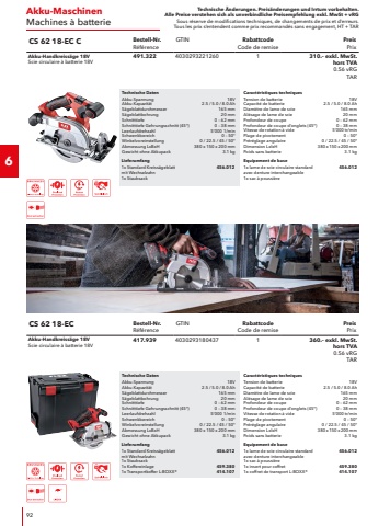 Technische %u00c4nderungen. Preis%u00e4nderungen und Irrtum vorbehalten.Alle Preise verstehen sich als unverbindliche Preisempfehlung exkl. MwSt + vRGSous r%u00e9serve de modifications techniques, de changements de prix et d%u2019erreurs. Tous les prix s%u2018entendent comme prix recommand%u00e9s sans engagement, HT + TAR445Technische DatenLeistungsaufnahme1100 WLeistungsabgabe600 WSpannung230 VFrequenz50/60 HzLeerlaufhubzahl0 %u2013 2%u2018700 1/minHub28 mmMax. Materialst%u00e4rke Holz230 mmMax. Materialst%u00e4rke Metall20 mmKabell%u00e4nge4.0 mAbmessung LxBxH510 x 94 x 170 mmGewicht3.6 kgLieferumfang1x Transportkoffer436.607Caract%u00e9ristiques techniquesPuissance absorb%u00e9e1100 WPuissance utile600 WTension230 VFr%u00e9quence50/60 HzVitesse de cycle %u00e0 vide0 %u2013 2%u2018700 tr/minCourse28 mm%u00c9paisseur de mat%u00e9riau max. bois230 mm%u00c9paisseur de mat%u00e9riau max. m%u00e9tal20 mmLongueur de c%u00e2ble4.0 mDimension LxlxH510 x 94 x 170 mmPoids3.6 kgEquipement de base1x coffret de transport436.607RS 11-28Bestell-Nr.R%u00e9f%u00e9renceGTINRabattcodeCode de remisePreisPrix1100 Watt Universal-S%u00e4bels%u00e4ge mitGasgebeschalterScie sabre universelle 1100 Watt %u00e0g%u00e2chette %u00e0 vitesse variable432.77640302931870231215.%u2013 exkl. MwSt. hors TVA 0.56 vRGTARS%u00e4genSciesTechnische DatenLeistungsaufnahme1300 WLeistungsabgabe600 WSpannung230 VFrequenz50/60 HzLeerlaufhubzahl0 %u2013 3%u2018000 1/minHub32 mmMax. Materialst%u00e4rke Holz230 mmMax. Materialst%u00e4rke Metall20 mmKabell%u00e4nge4.0 mAbmessung LxBxH510 x 93 x 175 mmGewicht4.6 kgLieferumfang1x Transportkoffer455.059Caract%u00e9ristiques techniquesPuissance absorb%u00e9e1300 WPuissance utile600 WTension230 VFr%u00e9quence50/60 HzVitesse de cycle %u00e0 vide0 %u2013 3%u2018000 tr/minCourse32 mm%u00c9paisseur de mat%u00e9riau max. bois230 mm%u00c9paisseur de mat%u00e9riau max. m%u00e9tal20 mmLongueur de c%u00e2ble4.0 mDimension LxlxH510 x 93 x 175 mmPoids4.6 kgEquipement de base1x coffret de transport455.059RS 13-32Bestell-Nr.R%u00e9f%u00e9renceGTINRabattcodeCode de remisePreisPrix1300 Watt S%u00e4bels%u00e4ge mit variabler GeschwindigkeitScie sabre 1300 Watt %u00e0vitesse variable438.38340302931908011320.%u2013 exkl. MwSt. hors TVA 0.56 vRGTARTechnische DatenLeistungsaufnahme1300 WLeistungsabgabe600 WSpannung230 VFrequenz50/60 HzLeerlaufhubzahl0 %u2013 3%u2018000 1/minHub32 mmMax. Materialst%u00e4rke Holz230 mmMax. Materialst%u00e4rke Metall20 mmKabell%u00e4nge4.0 mAbmessung LxBxH510 x 93 x 175 mmGewicht4.6 kgLieferumfang1x Transportkoffer455.059Caract%u00e9ristiques techniquesPuissance absorb%u00e9e1300 WPuissance utile600 WTension230 VFr%u00e9quence50/60 HzVitesse de cycle %u00e0 vide0 %u2013 3%u2018000 tr/minCourse32 mm%u00c9paisseur de mat%u00e9riau max. bois230 mm%u00c9paisseur de mat%u00e9riau max. m%u00e9tal20 mmLongueur de c%u00e2ble4.0 mDimension LxlxH510 x 93 x 175 mmPoids4.6 kgEquipement de base1x coffret de transport455.059RSP 13-32Bestell-Nr.R%u00e9f%u00e9renceGTINRabattcodeCode de remisePreisPrix1300 Watt S%u00e4bels%u00e4ge mit PendelhubScie sabre pendulaire 1300 Watt438.36740302931907951375.%u2013 exkl. MwSt. hors TVA 0.56 vRGTAR
