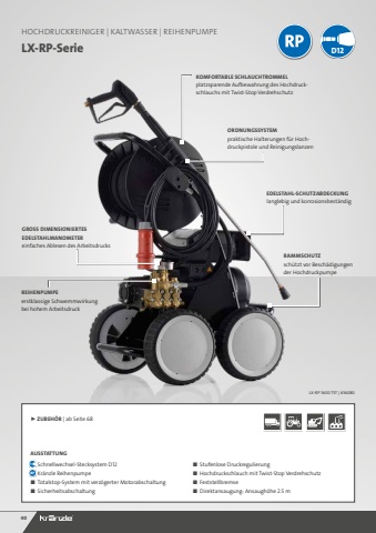 24quadro 10/130 TST | 608002quadro 10/130 TSTD12HOCHDRUCKREINIGER | KALTWASSERRAMMSCHUTZsch%u00fctzt vor Besch%u00e4digungen der HochdruckpumpeKOMFORTABLE SCHLAUCHTROMMELplatzsparende Aufbewahrung des Hochdruckschlauchs mit Twist-Stop Verdrehschutz GROSS DIMENSIONIERTES EDELSTAHLMANOMETER einfaches Ablesen des ArbeitsdrucksROTO-MOLD-CHASSISpraktisch unzerst%u00f6rbares Kunststoff-Geh%u00e4useORDNUNGSSYSTEMpraktische Halterungen f%u00fcr Hochdruckpistole und ReinigungslanzenAUSSTATTUNGSchnellwechsel-Stecksystem D12%u25a0Kr%u00e4nzle Axialpumpe%u25a0Totalstop-System%u25a0Stufenlose Druckregulierung %u25a0Hochdruckschlauch mit Twist-Stop Verdrehschutz%u25a0Reinigungsmittelansaugung %u25a0Feststellbremse %u25a0Wasserkasten: Volumen 5 l%u25ba ZUBEH%u00d6R Seite 26-27WASSERKASTENverhindert Sch%u00e4den an der Hochdruckpumpe bei Wassermangel