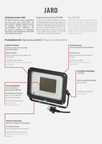 LED Arbeitsstrahler JARODer JARO LED Strahler ist extrem energieeffizient und wird durch seine extrem flache und robuste Bauform h%u00f6chsten Anspr%u00fcchen gerecht. Die verbauten SMD-LEDs sorgen f%u00fcr eine aussergew%u00f6hnlich lange Lebensdauer und eine spezielle Lichtstreuung f%u00fcr grossfl%u00e4chige Ausleuchtung. Zudem %u00fcberzeugt der LED-Strahler durch folgende Eigenschaften:JAROVerstellbarer Halteb%u00fcgelzur MontageExtrem leuchtstarkDurch superhelle und leistungsstarke SMD-LEDs.Produkt%u00fcbersicht / Aper%u00e7u des produits / Panoramica del prodottoProjecteur de travail %u00e0 LED JAROLe projecteur %u00e0 LED JARO est extr%u00eamement efficace sur le plan %u00e9nerg%u00e9tique et r%u00e9pond aux exigences les plus %u00e9lev%u00e9es gr%u00e2ce %u00e0 sa forme extr%u00eamement plate et robuste. Les LED SMD int%u00e9gr%u00e9es garantissent une dur%u00e9e de vie exceptionnellement longue et une diffusion sp%u00e9ciale de la lumi%u00e8re pour un %u00e9clairage sur une grande surface. De plus, le spot %u00e0 LED convainc par les caract%u00e9ristiques suivantes :Faro LED JAROIl faretto LED JARO %u00e8 estremamente efficiente dal punto di vista energetico e soddisfa le esigenze pi%u00f9 elevate grazie al suo design estremamente piatto e robusto. I LED SMD integrati garantiscono una durata eccezionalmente lunga e una speciale diffusione della luce per l%u2018illuminazione di grandi superfici. Inoltre, il faretto LED convince per le seguenti caratteristiche:Extr%u00eamement lumineuxGr%u00e2ce %u00e0 des LED SMD super lumineuses et puissantes.Estremamente luminosoGrazie ai potenti e luminosissimi LED SMD.Etrier de maintien r%u00e9glablepour le montageManiglione regolabileper il montaggioRobustes Geh%u00e4useSolides, modernes und hochwertiges Aluminium-Geh%u00e4use.Robuste FrontscheibeRobuste Frontscheibe aus Sicherheitsglas.Einfache Montagedurch aussenliegende, Federkraftklemme.Bo%u00eetier robusteBo%u00eetier en aluminium solide, moderne et de haute qualit%u00e9.Pare-brise robustePare-brise robuste en verre de s%u00e9curit%u00e9.Alloggiamento robustoAlloggiamento in alluminio solido, moderno e di alta qualit%u00e0.Robusto parabrezza anterioreRobusto parabrezza anteriore in vetro di sicurezza.Montage facilegr%u00e2ce %u00e0 une borne %u00e0 ressort ext%u00e9rieure et %u00e9tanche.Montaggio semplicegrazie al morsetto a molla esterno e impermeabile.