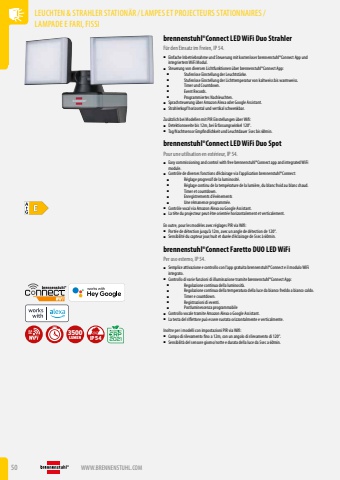 50 WWW.BRENNENSTUHL.COMLEUCHTEN & STRAHLER STATION%u00c4R /LAMPES ET PROJECTEURS STATIONNAIRES/LAMPADE E FARI, FISSIbrennenstuhl%u00aeConnect LED WiFi Duo StrahlerF%u00fcr den Einsatz im Freien, IP 54.%u25a0 Einfache Inbetriebnahme und Steuerung mit kostenloser brennenstuhl%u00aeConnect App und integriertem WiFi Modul. %u25a0 Steuerung von diversen Lichtfunktionen %u00fcber brennenstuhl%u00aeConnect App: %u25a0 Stufenlose Einstellung der Leuchtst%u00e4rke. %u25a0 Stufenlose Einstellung der Lichttemperatur von kaltweiss bis warmweiss. %u25a0 Timer und Countdown. %u25a0 Event Records. %u25a0 Programmiertes Nachleuchten. %u25a0 Sprachsteuerung %u00fcber Amazon Alexa oder Google Assistant.%u25a0 Strahlerkopf horizontal und vertikal schwenkbar.Zus%u00e4tzlich bei Modellen mit PIR Einstellungen %u00fcber Wifi: %u25a0 Detektionsweite bis 12m, bei Erfassungswinkel 120%u00b0. %u25a0 Tag/Nachtsensor Empfindlichkeit und Leuchtdauer 5sec bis 60min.brennenstuhl%u00aeConnect LED WiFi Duo SpotPour une utilisation en ext%u00e9rieur, IP 54.%u25a0 Easy commissioning and control with free brennenstuhl%u00aeConnect app and integrated WiFi module. %u25a0 Contr%u00f4le de diverses fonctions d%u2019%u00e9clairage via l%u2019application brennenstuhl%u00aeConnect: %u25a0 R%u00e9glage progressif de la luminosit%u00e9. %u25a0 R%u00e9glage continu de la temp%u00e9rature de la lumi%u00e8re, du blanc froid au blanc chaud. %u25a0 Timer et countdown. %u25a0 Enregistrements d%u2019%u00e9v%u00e9nements %u25a0 Une r%u00e9manence programm%u00e9e.%u25a0 Contr%u00f4le vocal via Amazon Alexa ou Google Assistant.%u25a0 La t%u00eate du projecteur peut %u00eatre orient%u00e9e horizontalement et verticalement.En outre, pour les mod%u00e8les avec r%u00e9glages PIR via Wifi:%u25a0 Port%u00e9e de d%u00e9tection jusqu%u2019%u00e0 12m, avec un angle de d%u00e9tection de 120%u00b0. %u25a0 Sensibilit%u00e9 du capteur jour/nuit et dur%u00e9e d%u2019%u00e9clairage de 5sec %u00e0 60min.brennenstuhl%u00aeConnect Faretto DUO LED WiFi Per uso esterno, IP 54.%u25a0 Semplice attivazione e controllo con l%u2019app gratuita brennenstuhl%u00aeConnect e il modulo WiFi integrato.%u25a0 Controllo di varie funzioni di illuminazione tramite brennenstuhl%u00aeConnect App: %u25a0 Regolazione continua della luminosit%u00e0. %u25a0 Regolazione continua della temperatura della luce da bianco freddo a bianco caldo. %u25a0 Timer e countdown. %u25a0 Registrazioni di eventi. %u25a0 Postluminescenza programmabile%u25a0 Controllo vocale tramite Amazon Alexa o Google Assistant.%u25a0 La testa del riflettore pu%u00f2 essere ruotata orizzontalmente e verticalmente.Inoltre per i modelli con impostazioni PIR via Wifi: %u25a0 Campo di rilevamento fino a 12m, con un angolo di rilevamento di 120%u00b0. %u25a0 Sensibilit%u00e0 del sensore giorno/notte e durata della luce da 5sec a 60min. IP543500LUMEN2,4GHz