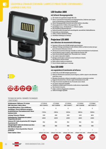 52 WWW.BRENNENSTUHL.COMLEUCHTEN & STRAHLER STATION%u00c4R /LAMPES ET PROJECTEURS STATIONNAIRES/LAMPADE E FARI, FISSILED Strahler JAROmit Infrarot-Bewegungsmelder%u25a0 LED-Strahler mit superhellen Everlight SMD-LEDs.%u25a0 Ideal zur automatischen Ausleuchtung von Eingangsbereichen, Einfahrten oder Carports sowie zur Abschreckung vor Einbruch und Diebstahl.%u25a0 Infrarot-Bewegungsmelder horizontal und vertikal stufenlos schwenkbar.%u25a0 Erfassungsbereich bis 10 Meter, Erfassungswinkel ca. 180%u00b0.%u25a0 Einschaltdauer von ca. 10 Sekunden bis ca. 5 Minuten regelbar.%u25a0 Mit einstellbarem D%u00e4mmerungssensor.%u25a0 Bedienerfreundliche Montage durch aussenliegende, wasserdichten Federkraftklemme.%u25a0 Frontscheibe aus Sicherheitsglas.%u25a0 Solides, modernes Aluminium-Geh%u00e4use.%u25a0 Verstellbarer Halteb%u00fcgel zur Montage.Projecteur LED JAROavec d%u00e9tecteur de mouvements infrarouge%u25a0 Projecteur %u00e0 LED avec des LED SMD Everlight super lumineuses.%u25a0 Id%u00e9al pour l%u2019%u00e9clairage automatique de zones d%u2019entr%u00e9e, d%u2019all%u00e9es ou d%u2019abris de voiture ainsi que pour la dissuasion d%u2019intrusions et de vols.%u25a0 D%u00e9tecteur de mouvement infrarouge orientable en continu horizontalement et verticalement.%u25a0 Zone de d%u00e9tection jusqu%u2019%u00e0 10 m%u00e8tres, angle de d%u00e9tection d%u2019environ 180%u00b0.%u25a0 Dur%u00e9e d%u2019enclenchement r%u00e9glable d%u2019env. 10 secondes %u00e0 env. 5 minutes.%u25a0 Avec capteur cr%u00e9pusculaire r%u00e9glable.%u25a0 Montage convivial gr%u00e2ce %u00e0 une borne %u00e0 ressort ext%u00e9rieure et %u00e9tanche.%u25a0 Vitre frontale en verre de s%u00e9curit%u00e9.%u25a0 Bo%u00eetier solide et moderne en aluminium.%u25a0 Etrier de fixation r%u00e9glable pour le montage.Faro LED JAROcon segnalatore di movimento ad infraross%u25a0 Faretto LED con LED SMD Everlight superluminosi.%u25a0 Ideale per l%u2019illuminazione automatica di aree d%u2019ingresso, vialetti o carport e come deterrente contro furti e scassi.%u25a0 Rilevatore di movimento a infrarossi orientabile in continuo in orizzontale e verticale.%u25a0 Raggio di rilevamento fino a 10 metri, angolo di rilevamento di circa 180%u00b0.%u25a0 Tempo di accensione regolabile da circa 10 secondi a circa 5 minuti.%u25a0 Con sensore crepuscolare regolabile.%u25a0 Installazione semplice grazie al morsetto a molla esterno e impermeabile.%u25a0 Vetro frontale di sicurezza.%u25a0 Solido e moderno alloggiamento in alluminio.%u25a0 Staffa di montaggio regolabile.TECHNISCHE DATEN / DONN%u00c9ES TECHNIQUES / DATI TECNICIArtikelnummer/ R%u00e9f%u00e9rence / N%u00b0 articolo 1171250142 1171250242 1171250342 1171250542 1171250842EAN/ Code-barre / Codice a Barre 4007123684953 4007123684960 4007123684977 4007123684984 4007123685127Energieeffizienzklasse / Classe d%u2019efficience %u00e9nerg%u00e9tique / Classe di efficienza energetica D D D D DGesamtlichtstrom/ Flux lumineux total/ Flusso luminoso totale 1150 lm 2300 lm 3450 lm 5800 lm 9200 lmLeistung / Puissance / Potenza 10 W 20 W 30 W 50 W 80 WFarbtemperatur/ Temp%u00e9rature de couleur/ Temperatura del colore 6500 K 6500 K 6500 K 6500 K 6500 KSchutzart (IP)/ Indice de protection (IP)/ Categoria di protezione (IP) IP65 IP65 IP65 IP65 IP65Schlagfestigkeit/ Indice de r%u00e9sistance aux chocs (IK)/ Resistenza agli urti IK08 IK08 IK08 IK08 IK08Schutzklasse / Classe de protection / Classe di protezione I I I I IFarbe / Couleur/ Colore schwarz/ noir/ nero schwarz/ noir/ nero schwarz/ noir/ nero schwarz/ noir/ nero schwarz/ noir/ nero1150LUMEN2300LUMEN3450LUMEN5800LUMEN9200LUMENIK08 IP65 10mMAX. 180%u00b0