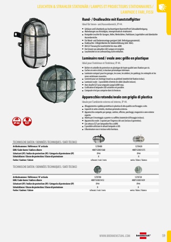 WWW.BRENNENSTUHL.COM 59LEUCHTEN & STRAHLER STATION%u00c4R /LAMPES ET PROJECTEURS STATIONNAIRES/LAMPADE E FARI, FISSIRund- / Ovalleuchte mit KunststoffgitterIdeal f%u00fcr Innen- und Aussenbereich, IP 44.%u25a0 Geh%u00e4use und Schutzkorb aus hochwertigem Kunststoff mit Schraubbefestigung.%u25a0 Abdeckungen aus Kristallglas, innenprismatisch strukturiert.%u25a0 Kompakte Leuchte f%u00fcr Garagen, Keller, Werkst%u00e4tten, Parkh%u00e4user, Lagerhallen und %u00fcberdachte Aussenbereiche.%u25a0 F%u00fcr Wand- und Deckenmontage geeignet (inkl. Befestigungsmaterial).%u25a0 Ovalleuchte: 3 M%u00f6glichkeiten f%u00fcr Kabeleinf%u00fchrung (inkl. T%u00fclle).%u25a0 Mit E27 Fassung f%u00fcr Leuchtmittel bis max. 60W.%u25a0 Der Einsatz von aktuellen LED Lampen ist m%u00f6glich. %u25a0 Leuchtmittel ist im Lieferumfang nicht enthalten.Luminaire rond / ovale avec grille en plastiqueId%u00e9al pour l%u2019ext%u00e9rieur et l%u2019int%u00e9rieur, IP 44.%u25a0 Bo%u00eetier et corbeille de protection en plastique de haute qualit%u00e9 avec fixation par vis.%u25a0 Caches en verre cristal, %u00e0 structure prismatique int%u00e9rieure.%u25a0 Luminaire compact pour les garages, les caves, les ateliers, les parkings, les entrep%u00f4ts et les zones ext%u00e9rieures couvertes.%u25a0 Convient pour un montage mural ou au plafond (mat%u00e9riel de fixation inclus).%u25a0 Luminaire ovale : 3 possibilit%u00e9s d%u2019entr%u00e9e de c%u00e2ble (douille incluse).%u25a0 Avec douille E27 pour ampoules jusqu%u2019%u00e0 60W max.%u25a0 L%u2019utilisation d%u2019ampoules LED actuelles est possible. %u25a0 L%u2019ampoule n%u2019est pas comprise dans la livraison.Apparecchio rotondo/ovale con griglia di plasticaIdeale per l%u2019ambiente esterno ed interno, IP 44.%u25a0 Alloggiamento e gabbia protettiva in plastica di alta qualit%u00e0 con fissaggio a vite.%u25a0 Coperchi in vetro cristallo, struttura prismatica interna.%u25a0 Apparecchio compatto per garage, cantine, officine, parcheggi, magazzini e aree esterne coperte.%u25a0 Adatto per il montaggio a parete e a soffitto (materiale di fissaggio incluso).%u25a0 Apparecchio ovale: 3 opzioni per l%u2019ingresso dei cavi (incluso il gommino).%u25a0 Con attacco E27 per lampadine fino a 60W.%u25a0 %u00c8 possibile utilizzare le attuali lampade a LED. %u25a0 L%u2019illuminatore non %u00e8 incluso nella fornitura.TECHNISCHE DATEN / DONN%u00c9ES TECHNIQUES / DATI TECNICIArtikelnummer/ R%u00e9f%u00e9rence / N%u00b0 articolo 1270400 1270420EAN/ Code-barre / Codice a Barre 4007123031368 4007123031375Schutzart (IP)/ Indice de protection (IP)/ Categoria di protezione (IP) IP44 IP44Schutzklasse / Classe de protection / Classe di protezione II IIFarbe / Couleur/ Colore schwarz/ noir/ nero weiss/ blanc/ biancoTECHNISCHE DATEN / DONN%u00c9ES TECHNIQUES / DATI TECNICIArtikelnummer/ R%u00e9f%u00e9rence / N%u00b0 articolo 1270700 1270720EAN/ Code-barre / Codice a Barre 4007123031412 4007123031429Schutzart (IP)/ Indice de protection (IP)/ Categoria di protezione (IP) IP44 IP44Schutzklasse / Classe de protection / Classe di protezione II IIFarbe / Couleur/ Colore schwarz/ noir/ nero weiss/ blanc/ biancoIP44 E27