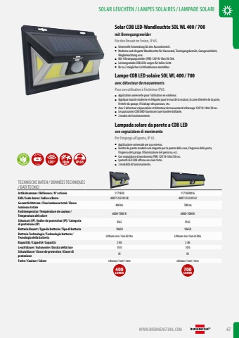 WWW.BRENNENSTUHL.COM 67SOLAR LEUCHTEN /LAMPES SOLAIRES/LAMPADE SOLARISolar COB LED-Wandleuchte SOL WL 400 / 700mit BewegungsmelderF%u00fcr den Einsatz im Freien, IP 65.%u25a0 Universelle Anwendung f%u00fcr den Aussenbereich.%u25a0 Moderne und elegante Wandleuchte f%u00fcr Hauswand, T%u00fcreingangsbereich, Garageneinfahrt, Wegbeleuchtung usw.%u25a0 Mit 1 Bewegungsmelder (PIR) 120%u00b0/8-10m/30 Sek.%u25a0 Leistungsstarke COB LEDs sorgen f%u00fcr helles Licht.%u25a0 Bis zu 2 m%u00f6glichen Lichtfunktionen einstellbar.Lampe COB LED solaire SOL WL 400 / 700avec d%u00e9tecteur de mouvementsPour une utilisation %u00e0 l%u2019ext%u00e9rieur IP65.%u25a0 Application universelle pour l%u2019utilisation en ext%u00e9rieur.%u25a0 Applique murale moderne et %u00e9l%u00e9gante pour le mur de la maison, la zone d%u2019entr%u00e9e de la porte, l%u2019entr%u00e9e du garage, l%u2019%u00e9clairage des parcours, etc.%u25a0 Avec 2 d%u00e9tecteur cr%u00e9pusculaire et d%u00e9tecteur de mouvement infrarouge 120%u00b0/8-10m/30 sec.%u25a0 Les puissantes COB SMD fournissent une lumi%u00e8re brillante.%u25a0 2 modes de fonctionnement.Lampada solare da parete a COB LEDcon segnalatore di movimentoPer l%u2019impiego all%u2019aperto, IP 65.%u25a0 Applicazione universale per uso esterno.%u25a0 Faretto da parete moderno ed elegante per la parete della casa, l%u2019ingresso della porta, l%u2019ingresso del garage, l%u2019illuminazione del percorso, ecc.%u25a0 Con segnalatore di movimento (PIR) 120%u00b0/8-10m/30 sec.%u25a0 I potenti LED COB offrono una luce forte.%u25a0 2 modalit%u00e0 di funzionamento.TECHNISCHE DATEN / DONN%u00c9ES TECHNIQUES / DATI TECNICIArtikelnummer/ R%u00e9f%u00e9rence / N%u00b0 articolo 1171830 1171830016EAN/ Code-barre / Codice a Barre 4007123310128 4007123310142Gesamtlichtstrom/ Flux lumineux total/ Flusso luminoso totale 400 lm 700 lmFarbtemperatur/ Temp%u00e9rature de couleur/ Temperatura del colore 6000-7000 K 6000-7000 KSchutzart (IP)/ Indice de protection (IP)/ Categoria di protezione (IP) IP65 IP65Batterie Bauart/ Type de batterie / Tipo di batteria 18650 18650Batterie Technologie / Technologie batterie / Tecnologia della batteria Lithium-Ion / Ioni di litio Lithium-Ion / Ioni di litioKapazit%u00e4t/ Capacit%u00e9 / Capacit%u00e0 2 Ah 2 AhLeuchtdauer/ Autonomie / Durata della luce 10 h 10 hSchutzklasse / Classe de protection / Classe di protezione III IIIFarbe / Couleur/ Colore schwarz/ noir/ nero schwarz/ noir/ nero400LUMEN700LUMENGREEN ENERGYGREEN ENERGYLi-IonINCLUSIVE 120%u00b0 10mMAX. IP65