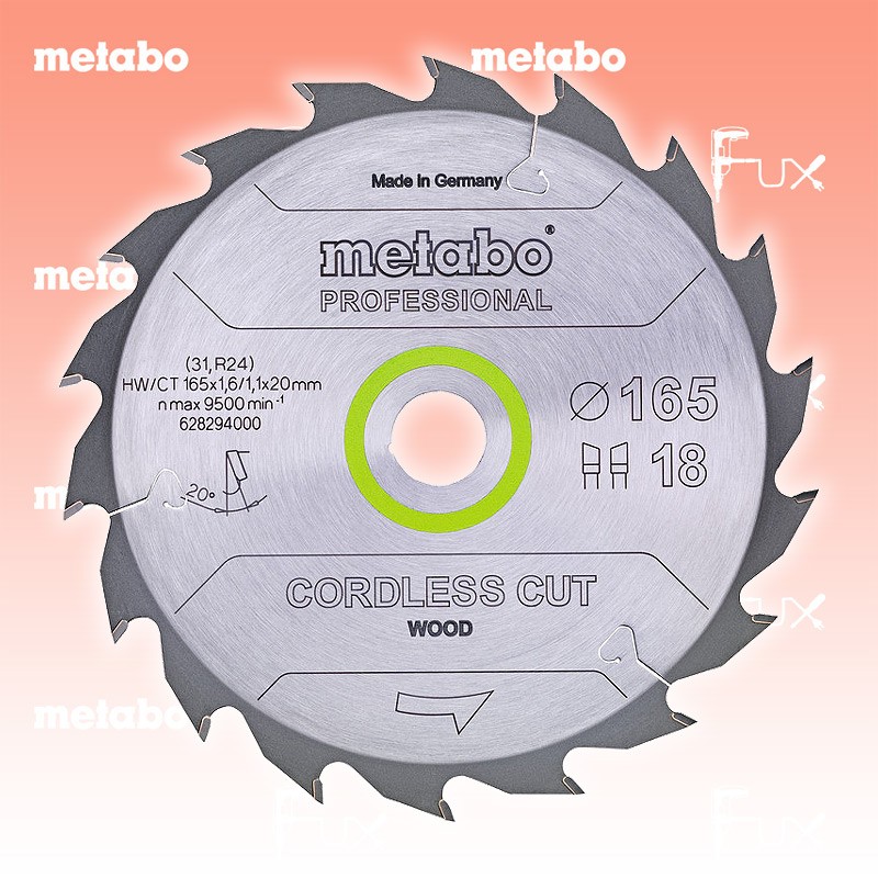 Das Ladenlokal bleibt vom 25. Dezember 2025 bis am 04. Januar 2026 geschlossen. Bestellungen und Lieferungen von Neugeräten werden trotz Ferienabwesenheit in gewohnter Fux-Manier entgegengenommen und ausgeliefert. Zu " Kreissägeblätter »cordless cut« wood" von Metabo Metabo Kreissägeblatt 165 mm professional Bestell- und Artikelnummer: 628295000 Maximale Laufzeit für Akku-Sägen durch extra dünne Stammblattdicke und Schnittbreite Deutlich mehr Schnitte pro Akkuladung im Vergleich zu Standard-Sägeblättern bei gleich hoher Standzeit Besonders hohe Standzeit durch beste Hartmetallqualität und feingeschliffene Zähne Präzise, geräuscharme und vibrationsminimierte Schnitte durch gelaserte Dehnschlitze (und teilweise Laserornamente), sowie gelaserte Stammblätter aus hochwertigstem Stahl Zum Kreissägeblatt-Finder Technische Daten Durchmesser x Schnittbreite x Bohrung 165 x 1.6 x 20 mm Material HW/CT Zähnezahl 36 Zahnform WZ Stammblattdicke 1.1 mm Spanwinkel 15° geeignet für KS 18 LTX 57 Verpackung Karton Standard-Ausrüstung Verkaufseinheit 1 Stk. Geliefert im Karton Listenpreis CHF 80.00 Fuxpreis CHF 68.00 inkl. 8.1% MwSt, inkl vRG Versand CHF 15.00 Kein Grauimport! Produkt bestellen Verkaufseinheit 1 Stk. 1 Stück 2 Stück 3 Stück 4 Stück 5 Stück 6 Stück 7 Stück 8 Stück 9 Stück 10 Stück 11 Stück 12 Stück 13 Stück 14 Stück 15 Stück 16 Stück 17 Stück 18 Stück 19 Stück 20 Stück 21 Stück 22 Stück 23 Stück 24 Stück 25 Stück 26 Stück 27 Stück 28 Stück 29 Stück 30 Stück 31 Stück 32 Stück 33 Stück 34 Stück 35 Stück 36 Stück 37 Stück 38 Stück 39 Stück 40 Stück 41 Stück 42 Stück 43 Stück 44 Stück 45 Stück 46 Stück 47 Stück 48 Stück 49 Stück 50 Stück Alle Angaben ohne Gewähr und solange Vorrat reicht!Wiederverkäufer werden?Lehrlingsrabatt? Produkt als PDF AKTION 15%