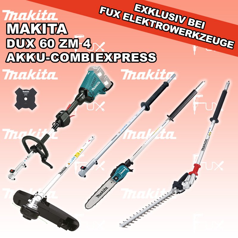 Das Ladenlokal bleibt vom 25. Dezember 2025 bis am 04. Januar 2026 geschlossen. Bestellungen und Lieferungen von Neugeräten werden trotz Ferienabwesenheit in gewohnter Fux-Manier entgegengenommen und ausgeliefert. Zu "Akku CombiExpress" von Makita FUX SPECIAL EXKLUSIV BEI FUX Makita DUX 60 ZM 4 Akku-CombiExpress Bestell- und Artikelnummer: DUX60ZM4 SET 11 DUX 60 ZM 4 Akku-CombiExpress mit GrasschneidekopfAkkuspannung 2 x 18 V Leerlaufdrehzahl 0 - 9700 min-1 Masse (LxBxH) 1011x320x216 mm Gewicht (EPTA) 4.1 kgInfos EN 402 MP Heckenscheren-Aufsatz 500 mmMax. Schnittbreite 50 cm Hubzahl 2400 / 2800 / 3400 / 4000 min⁻¹ Abmessung (L x B x H) 1444 x 144 x 85 mm Gewicht 2.4 kgInfos LE 400 MP Verlängerung Verlängerung für Heckenscheren und Säge Länge: 1 m Gewicht: 1.1 kgInfos EY403MP Hochentaster-AufsatzArbeitslänge 300 mm Teilung 3/8" Nutbreite 1.1 mm Nettogewicht 2.0 kgInfos 4 Zahn Dickichtmesser aus MetallDurchmesser Ø 230 mm Bohrung Ø 25.4 mm Dicke 1.8 mmInfos OHNE AKKUS UND LADEGERÄT Standard-Ausrüstung In diesem Set enthalten: DUX 60 ZM 4 Akku-CombiExpress mit Grasschneidekopf EN 402 MP Heckenscheren-Aufsatz 500 mm LE 400 MP Verlängerung EY403MP Hochentaster-Aufsatz 4 Zahn Dickichtmesser aus Metall Zubehör Listenpreis CHF 1'242.00 Fuxpreis CHF 824.00 inkl. 8.1% MwSt, inkl vRG Versand CHF 30.00 Kein Grauimport! Produkt bestellen 1 Stück 2 Stück 3 Stück 4 Stück 5 Stück 6 Stück 7 Stück 8 Stück 9 Stück 10 Stück Alle Angaben ohne Gewähr und solange Vorrat reicht!Wiederverkäufer werden? Produkt als PDF AKTION 33%