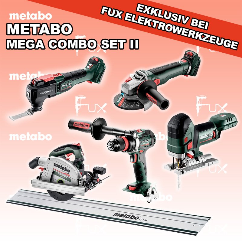 Das Ladenlokal bleibt vom 25. Dezember 2025 bis am 04. Januar 2026 geschlossen. Bestellungen und Lieferungen von Neugeräten werden trotz Ferienabwesenheit in gewohnter Fux-Manier entgegengenommen und ausgeliefert. Heute auf dieses Produkt 48% Rabatt! Zu "Combo Set 18 Volt " von Metabo FULL Service: 36 Monate zum Nulltarif für Sie! Weitere Infos zum FULL Service Dieses Produkt ist CAS kompatibel! Weitere Infos zu CAS Sparfux Aktionen FUX SPECIAL EXKLUSIV BEI FUX Metabo Mega Combo Set 2 SOLO Bestell- und Artikelnummer: Mega Combo Set 2 SOLO STA 18 LTX 150 BL Akku-StichsägeAkkuspannung 18 V Hubzahl 1.000-3.500 /min Gewicht ohne Akkupack 1.9 kgInfos BS 18 LTX BL Q I Akku-BohrschrauberAkkuspannung 18 V Drehzahl 0-550 / 0-2000 U/min Drehmoment hart / weich 130 / 65 Nm Gewicht (mit Akkupack) 2.3 kgInfos MT 18 LTX BL QSL Akku-Multitool Akkuspannung 18 V Schwingzahl bei Leerlauf 8.000 - 20.000 /min Schleifplatte, Maß Eck zu Eck 93 mm Gewicht 1.7 kgInfos WVB 18 LT BL 11-125 Quick Akku-WinkelschleiferAkkuspannung 18 V Drehzahl 2.800 - 10.000 / min Ø 125 mm Scheiben Gewicht (mit Akkupack) 2.5 kgInfos KS 18 LTX 66 BL Akku HandkreissägeAkkuspannung 18 V Schnitt-Tiefe bei 90° 0-66 mm Sägeblatt 165 mm Gewicht 4.5 kgInfos FS 160 FührungsschieneGesamtlänge 1600 mmInfos Registriere die in diesem Set vorhandenen Metabo Maschinen auf metabo.ch, und ergattere dir bis zu 5 Gratis Akkus!Zusätzlich offerieren wir zu diesem Set einen Gratis Akku!OHNE AKKUS UND LADEGERÄT Standard-Ausrüstung In diesem Set enthalten: STA 18 LTX 150 BL Akku-Stichsäge BS 18 LTX BL Q I Akku-Bohrschrauber MT 18 LTX BL QSL Akku-Multitool WVB 18 LT BL 11-125 Quick Akku-Winkelschleifer KS 18 LTX 66 BL Akku Handkreissäge FS 160 Führungsschiene Zubehör Verbrauchsmaterial Listenpreis CHF 1'909.50 Fuxpreis CHF 987.00 inkl. 8.1% MwSt, inkl vRG Versand CHF 30.00 Kein Grauimport! Produkt bestellen 1 Stück 2 Stück 3 Stück 4 Stück 5 Stück 6 Stück 7 Stück 8 Stück 9 Stück 10 Stück Alle Angaben ohne Gewähr und solange Vorrat reicht!Wiederverkäufer werden? Produkt als PDFVideo LiHD 1Video LiHD 2 AKTION 48%