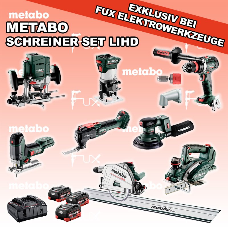 Das Ladenlokal bleibt vom 25. Dezember 2025 bis am 04. Januar 2026 geschlossen. Bestellungen und Lieferungen von Neugeräten werden trotz Ferienabwesenheit in gewohnter Fux-Manier entgegengenommen und ausgeliefert. Heute auf dieses Produkt 40% Rabatt! Zu "Schreiner Set" von Metabo FULL Service: 36 Monate zum Nulltarif für Sie! Weitere Infos zum FULL Service Dieses Produkt ist CAS kompatibel! Weitere Infos zu CAS Sparfux Aktionen FUX SPECIAL EXKLUSIV BEI FUX Metabo Schreiner Set XXL 1 LiHD Bestell- und Artikelnummer: Schreiner Set XXL 1 LiHD ST 18 LT 130 BL Akku-StichsägeAkkuspannung 18 V Hubzahl 1000-3.500 /min Gewicht ohne Akkupack 1.5 kgInfos BS 18 LTX BL Q I Akku-BohrschrauberAkkuspannung 18 V Drehzahl 0-550 / 0-2000 U/min Drehmoment hart / weich 130 / 65 Nm Gewicht (mit Akkupack) 2.3 kgInfos FMV 18 LTX BL 8 Akku Kantenfräse Akkuspannung 18 V Leerlaufdrehzahl 4.800 - 29.000 /min Spannbohrung der Spannzange 6 / 8 mmInfos OFV 18 LTX BL 12 Akku-OberfräseAkkuspannung 18 V Leerlaufdrehzahl 11.000 - 25.000 / min Spannbohrung der Spannzange 6 / 8 / 12 mm Gewicht ohne Akkupack 2.900 gInfos KT 18 LTX 66 BL Akku TauchkreissägeAkkuspannung 18 V Schnitt-Tiefe bei 90° 0-66 mm Sägeblatt 165 mm Gewicht 5.3 kgInfos HO 18 LTX 20-82 Akku-Einhand-HobelAkkuspannung 18 V Hobelbreite 82 mm Spanabnahme einstellbar 0-2 mm Gewicht 3.5 KgInfos MT 18 LTX BL QSL Akku-Multitool Akkuspannung 18 V Schwingzahl bei Leerlauf 8.000 - 20.000 /min Schleifplatte, Maß Eck zu Eck 93 mm Gewicht 1.7 kgInfos SXA 18 LTX 150 BL Exzenterschleifer Akkuspannung 18 V Durchmesser des Stütztellers 150 mm Leerlaufdrehzahl 4000 - 10000 /min Gewicht (mit Akkupack) 1.7 kg Infos FS 160 FührungsschieneGesamtlänge 1600 mmInfos 3 x 18 V, 5.5 Ah, LiHD Akkupack18 V 5.5 Ah ( LiHD Akkus ) Infos ASC 145, 12 - 36 V "Air Cooled" LadegerätZum Aufladen aller Li-Power Schiebesitz-Akkupacks (12 V - 36 V). Ladestrom 8.0 AInfos Schnellwechselbithalter »Quick«Schnellwechselbithalter »Quick« Geeignet für alle Metabo "Quick" Maschinen Bits mit 1/4 "Außensechskantantrieb Infos Schnellwechselwinkeladapter »Quick«Metabo "Quick" Maschinen mit Spannzange Ø 43 mm Magnetischer Bithalter mit 1/4 "(6,35 mm) SechskantschaftInfos Registriere die in diesem Set vorhandenen Metabo Maschinen auf metabo.ch, und ergattere dir bis zu 5 Gratis Akkus!Zusätzlich offerieren wir zu diesem Set einen Gratis Akku! Standard-Ausrüstung In diesem Set enthalten: ST 18 LT 130 BL Akku-Stichsäge BS 18 LTX BL Q I Akku-Bohrschrauber FMV 18 LTX BL 8 Akku Kantenfräse OFV 18 LTX BL 12 Akku-Oberfräse KT 18 LTX 66 BL Akku Tauchkreissäge HO 18 LTX 20-82 Akku-Einhand-Hobel MT 18 LTX BL QSL Akku-Multitool SXA 18 LTX 150 BL Exzenterschleifer FS 160 Führungsschiene 3 x 18 V, 5.5 Ah, LiHD Akkupack ASC 145, 12 - 36 V "Air Cooled" Ladegerät Schnellwechselbithalter »Quick« Schnellwechselwinkeladapter »Quick« Zubehör Verbrauchsmaterial Listenpreis CHF 3'628.50 Fuxpreis CHF 2'177.00 inkl. 8.1% MwSt, inkl vRG Versand CHF 40.00 Kein Grauimport! Produkt bestellen 1 Stück 2 Stück 3 Stück 4 Stück 5 Stück 6 Stück 7 Stück 8 Stück 9 Stück 10 Stück Alle Angaben ohne Gewähr und solange Vorrat reicht!Wiederverkäufer werden? Produkt als PDFVideo LiHD 1Video LiHD 2 AKTION 40%