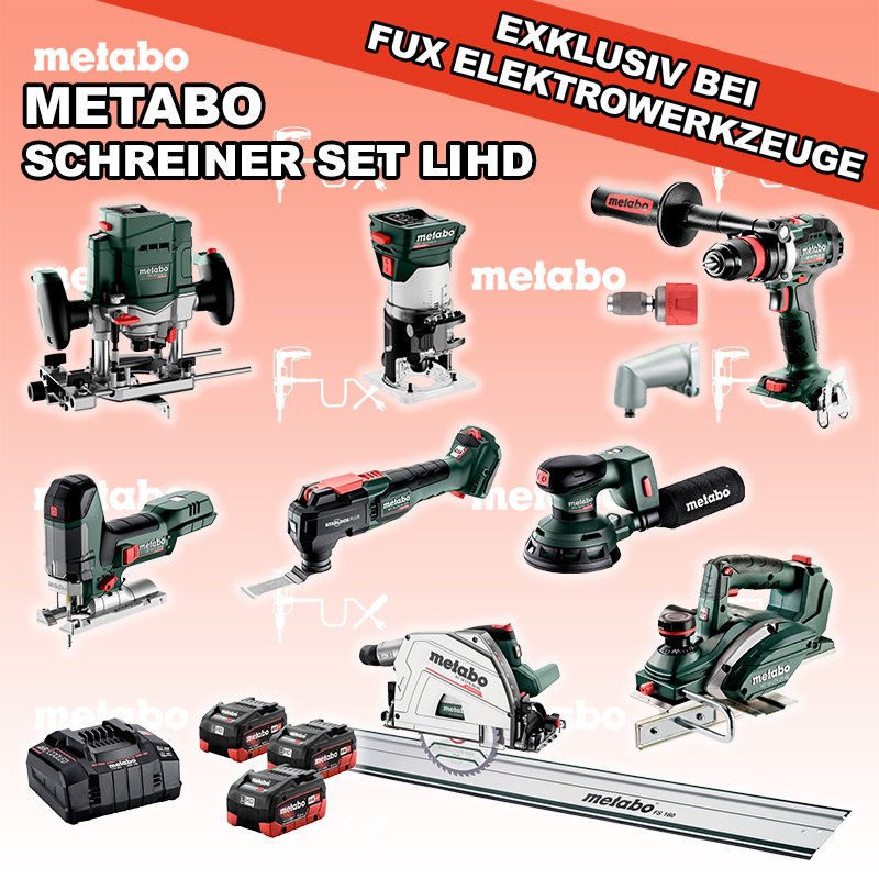 Das Ladenlokal bleibt vom 25. Dezember 2025 bis am 04. Januar 2026 geschlossen. Bestellungen und Lieferungen von Neugeräten werden trotz Ferienabwesenheit in gewohnter Fux-Manier entgegengenommen und ausgeliefert. Heute auf dieses Produkt 40% Rabatt! Zu "Schreiner Set" von Metabo FULL Service: 36 Monate zum Nulltarif für Sie! Weitere Infos zum FULL Service Dieses Produkt ist CAS kompatibel! Weitere Infos zu CAS Sparfux Aktionen FUX SPECIAL EXKLUSIV BEI FUX Metabo Schreiner Set XXL 3 LiHD Bestell- und Artikelnummer: Schreiner Set XXL 3 LiHD ST 18 LT 130 BL Akku-StichsägeAkkuspannung 18 V Hubzahl 1000-3.500 /min Gewicht ohne Akkupack 1.5 kgInfos BS 18 LTX BL Q I Akku-BohrschrauberAkkuspannung 18 V Drehzahl 0-550 / 0-2000 U/min Drehmoment hart / weich 130 / 65 Nm Gewicht (mit Akkupack) 2.3 kgInfos FMV 18 LTX BL 8 Akku Kantenfräse Akkuspannung 18 V Leerlaufdrehzahl 4.800 - 29.000 /min Spannbohrung der Spannzange 6 / 8 mmInfos OFV 18 LTX BL 12 Akku-OberfräseAkkuspannung 18 V Leerlaufdrehzahl 11.000 - 25.000 / min Spannbohrung der Spannzange 6 / 8 / 12 mm Gewicht ohne Akkupack 2.900 gInfos KT 18 LTX 66 BL Akku TauchkreissägeAkkuspannung 18 V Schnitt-Tiefe bei 90° 0-66 mm Sägeblatt 165 mm Gewicht 5.3 kgInfos HO 18 LTX 20-82 Akku-Einhand-HobelAkkuspannung 18 V Hobelbreite 82 mm Spanabnahme einstellbar 0-2 mm Gewicht 3.5 KgInfos MT 18 LTX BL QSL Akku-Multitool Akkuspannung 18 V Schwingzahl bei Leerlauf 8.000 - 20.000 /min Schleifplatte, Maß Eck zu Eck 93 mm Gewicht 1.7 kgInfos SXA 18 LTX 125 BL Exzenterschleifer Akkuspannung 18 V Durchmesser des Stütztellers 125 mm Leerlaufdrehzahl 4000 - 10000 /min Gewicht (mit Akkupack) 1.7 kg Infos FS 160 FührungsschieneGesamtlänge 1600 mmInfos 3 x 18 V, 5.5 Ah, LiHD Akkupack18 V 5.5 Ah ( LiHD Akkus ) Infos ASC 145, 12 - 36 V "Air Cooled" LadegerätZum Aufladen aller Li-Power Schiebesitz-Akkupacks (12 V - 36 V). Ladestrom 8.0 AInfos Schnellwechselbithalter »Quick«Schnellwechselbithalter »Quick« Geeignet für alle Metabo "Quick" Maschinen Bits mit 1/4 "Außensechskantantrieb Infos Schnellwechselwinkeladapter »Quick«Metabo "Quick" Maschinen mit Spannzange Ø 43 mm Magnetischer Bithalter mit 1/4 "(6,35 mm) SechskantschaftInfos Registriere die in diesem Set vorhandenen Metabo Maschinen auf metabo.ch, und ergattere dir bis zu 5 Gratis Akkus!Zusätzlich offerieren wir zu diesem Set einen Gratis Akku! Standard-Ausrüstung In diesem Set enthalten: ST 18 LT 130 BL Akku-Stichsäge BS 18 LTX BL Q I Akku-Bohrschrauber FMV 18 LTX BL 8 Akku Kantenfräse OFV 18 LTX BL 12 Akku-Oberfräse KT 18 LTX 66 BL Akku Tauchkreissäge HO 18 LTX 20-82 Akku-Einhand-Hobel MT 18 LTX BL QSL Akku-Multitool SXA 18 LTX 125 BL Exzenterschleifer FS 160 Führungsschiene 3 x 18 V, 5.5 Ah, LiHD Akkupack ASC 145, 12 - 36 V "Air Cooled" Ladegerät Schnellwechselbithalter »Quick« Schnellwechselwinkeladapter »Quick« Zubehör Verbrauchsmaterial Listenpreis CHF 3'598.50 Fuxpreis CHF 2'159.00 inkl. 8.1% MwSt, inkl vRG Versand CHF 40.00 Kein Grauimport! Produkt bestellen 1 Stück 2 Stück 3 Stück 4 Stück 5 Stück 6 Stück 7 Stück 8 Stück 9 Stück 10 Stück Alle Angaben ohne Gewähr und solange Vorrat reicht!Wiederverkäufer werden? Produkt als PDFVideo LiHD 1Video LiHD 2 AKTION 40%