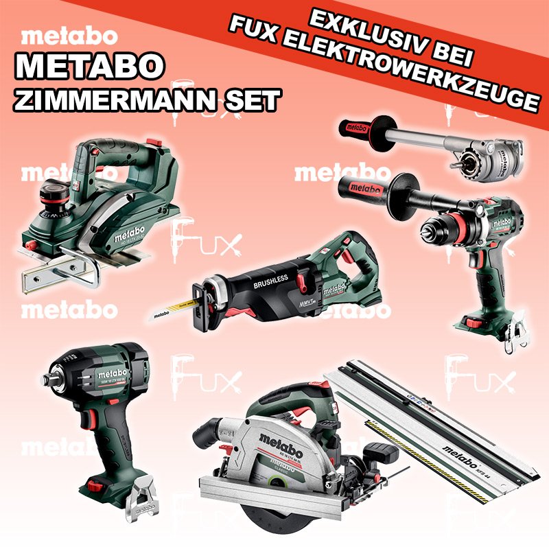 Das Ladenlokal bleibt vom 25. Dezember 2025 bis am 04. Januar 2026 geschlossen. Bestellungen und Lieferungen von Neugeräten werden trotz Ferienabwesenheit in gewohnter Fux-Manier entgegengenommen und ausgeliefert. Heute auf dieses Produkt 27% Rabatt! Zu "Zimmermann Set" von Metabo FULL Service: 36 Monate zum Nulltarif für Sie! Weitere Infos zum FULL Service Dieses Produkt ist CAS kompatibel! Weitere Infos zu CAS Sparfux Aktionen FUX SPECIAL EXKLUSIV BEI FUX Metabo Zimmermann SET 2 SOLO Bestell- und Artikelnummer: Zimmermann SET 2 SOLO BS 18 LTX BL Q I Akku-BohrschrauberAkkuspannung 18 V Drehzahl 0-550 / 0-2000 U/min Drehmoment hart / weich 130 / 65 Nm Gewicht (mit Akkupack) 2.3 kgInfos SSW 18 LTX 550 BL Akku-SchlagschrauberAkkuspannung 18 V Anziehdrehmoment 550 Nm Werkzeugaufnahme 1/2" Gewicht ohne Akkupack 1,4 kgInfos SSEP 18 LTX BL MVT Akku-SäbelsägeAkkuspannung 18 V Hubzahl bei Leerlauf 0 - 3.000 /min Gewicht (mit Akkupack) 4.6 kgInfos HO 18 LTX 20-82 Akku-Einhand-HobelAkkuspannung 18 V Hobelbreite 82 mm Spanabnahme einstellbar 0-2 mm Gewicht 3.5 KgInfos KS 18 LTX 66 BL Akku HandkreissägeAkkuspannung 18 V Schnitt-Tiefe bei 90° 0-66 mm Sägeblatt 165 mm Gewicht 4.5 kgInfos Drehmomentvorsatz Power X3Drehmomentvorsatz ermöglicht dreifache Leistungssteigerung der Maschine (Drehmoment) für härteste AnwendungenInfos Kappschiene KFS 44Gesamtlänge 834 mm Schnittlänge 440 mmInfos Registriere die in diesem Set vorhandenen Metabo Maschinen auf metabo.ch, und ergattere dir bis zu 5 Gratis Akkus!Zusätzlich offerieren wir zu diesem Set einen Gratis Akku!OHNE AKKUS UND LADEGERÄT Standard-Ausrüstung In diesem Set enthalten: BS 18 LTX BL Q I Akku-Bohrschrauber SSW 18 LTX 550 BL Akku-Schlagschrauber SSEP 18 LTX BL MVT Akku-Säbelsäge HO 18 LTX 20-82 Akku-Einhand-Hobel KS 18 LTX 66 BL Akku Handkreissäge Drehmomentvorsatz Power X3 Kappschiene KFS 44 Listenpreis CHF 2'148.50 Fuxpreis CHF 1'553.00 inkl. 8.1% MwSt, inkl vRG Versand CHF 25.00 Kein Grauimport! Produkt bestellen 1 Stück 2 Stück 3 Stück 4 Stück 5 Stück 6 Stück 7 Stück 8 Stück 9 Stück 10 Stück Alle Angaben ohne Gewähr und solange Vorrat reicht!Wiederverkäufer werden? Produkt als PDF NEUHEITAKTION 27%