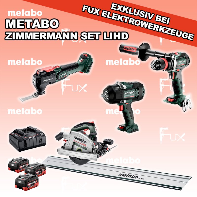 Das Ladenlokal bleibt vom 25. Dezember 2025 bis am 04. Januar 2026 geschlossen. Bestellungen und Lieferungen von Neugeräten werden trotz Ferienabwesenheit in gewohnter Fux-Manier entgegengenommen und ausgeliefert. Heute auf dieses Produkt 27% Rabatt! Zu "Zimmermann Set" von Metabo FULL Service: 36 Monate zum Nulltarif für Sie! Weitere Infos zum FULL Service Dieses Produkt ist CAS kompatibel! Weitere Infos zu CAS Sparfux Aktionen FUX SPECIAL EXKLUSIV BEI FUX Metabo Zimmermann SET 18 LiHD Bestell- und Artikelnummer: Zimmermann SET 18 LiHD BS 18 LTX BL Q I Akku-BohrschrauberAkkuspannung 18 V Drehzahl 0-550 / 0-2000 U/min Drehmoment hart / weich 130 / 65 Nm Gewicht (mit Akkupack) 2.3 kgInfos MT 18 LTX BL QSL Akku-Multitool Akkuspannung 18 V Schwingzahl bei Leerlauf 8.000 - 20.000 /min Schleifplatte, Maß Eck zu Eck 93 mm Gewicht 1.7 kgInfos SSW 18 LTX 1450 BL Akku-SchlagschrauberAkkuspannung 18 V Anziehdrehmoment 1450 Nm Werkzeugaufnahme 1/2" Infos KS 18 LTX 66 BL Akku HandkreissägeAkkuspannung 18 V Schnitt-Tiefe bei 90° 0-66 mm Sägeblatt 165 mm Gewicht 4.5 kgInfos FS 160 FührungsschieneGesamtlänge 1600 mmInfos 3 x 18 V, 5.5 Ah, LiHD Akkupack18 V 5.5 Ah ( LiHD Akkus ) Infos ASC 145, 12 - 36 V "Air Cooled" LadegerätZum Aufladen aller Li-Power Schiebesitz-Akkupacks (12 V - 36 V). Ladestrom 8.0 AInfos Registriere die in diesem Set vorhandenen Metabo Maschinen auf metabo.ch, und ergattere dir bis zu 5 Gratis Akkus!Zusätzlich offerieren wir zu diesem Set einen Gratis Akku! Standard-Ausrüstung In diesem Set enthalten: BS 18 LTX BL Q I Akku-Bohrschrauber MT 18 LTX BL QSL Akku-Multitool SSW 18 LTX 1450 BL Akku-Schlagschrauber KS 18 LTX 66 BL Akku Handkreissäge FS 160 Führungsschiene 3 x 18 V, 5.5 Ah, LiHD Akkupack ASC 145, 12 - 36 V "Air Cooled" Ladegerät Listenpreis CHF 2'142.50 Fuxpreis CHF 1'549.00 inkl. 8.1% MwSt, inkl vRG Versand CHF 25.00 Kein Grauimport! Produkt bestellen 1 Stück 2 Stück 3 Stück 4 Stück 5 Stück 6 Stück 7 Stück 8 Stück 9 Stück 10 Stück Alle Angaben ohne Gewähr und solange Vorrat reicht!Wiederverkäufer werden? Produkt als PDF NEUHEITAKTION 27%