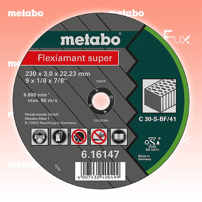 Das Ladenlokal bleibt vom 25. Dezember 2025 bis am 04. Januar 2026 geschlossen. Bestellungen und Lieferungen von Neugeräten werden trotz Ferienabwesenheit in gewohnter Fux-Manier entgegengenommen und ausgeliefert. Zu "Qualitätsklasse C 30 S Trennscheiben" von Metabo Metabo Trennscheibe Stein 115 mm Bestell- und Artikelnummer: 616728000 Universalscheibe zur Bearbeitung von Natur und Kunststein Härte: mittel Hohe Schnittleistung bei hoher Standzeit Arbeitshöchstgeschwindigkeit 80 m/s Technische Daten Qualitätsklasse C 30 S Durchmesser x Dicke x Bohrung 115 x 2,5 x 22,23 mm Ausführung gekröpft Max. Drehzahl 13300 Standard-Ausrüstung Verkaufseinheit 25 Stk. Listenpreis CHF 75.00 Fuxpreis CHF 64.00 inkl. 8.1% MwSt, inkl vRG Versand CHF 15.00 Kein Grauimport! Produkt bestellen Verkaufseinheit 25 Stk. 1 Stück 2 Stück 3 Stück 4 Stück 5 Stück 6 Stück 7 Stück 8 Stück 9 Stück 10 Stück 11 Stück 12 Stück 13 Stück 14 Stück 15 Stück 16 Stück 17 Stück 18 Stück 19 Stück 20 Stück 21 Stück 22 Stück 23 Stück 24 Stück 25 Stück 26 Stück 27 Stück 28 Stück 29 Stück 30 Stück 31 Stück 32 Stück 33 Stück 34 Stück 35 Stück 36 Stück 37 Stück 38 Stück 39 Stück 40 Stück 41 Stück 42 Stück 43 Stück 44 Stück 45 Stück 46 Stück 47 Stück 48 Stück 49 Stück 50 Stück Alle Angaben ohne Gewähr und solange Vorrat reicht!Wiederverkäufer werden?Lehrlingsrabatt? Produkt als PDF AKTION 15%