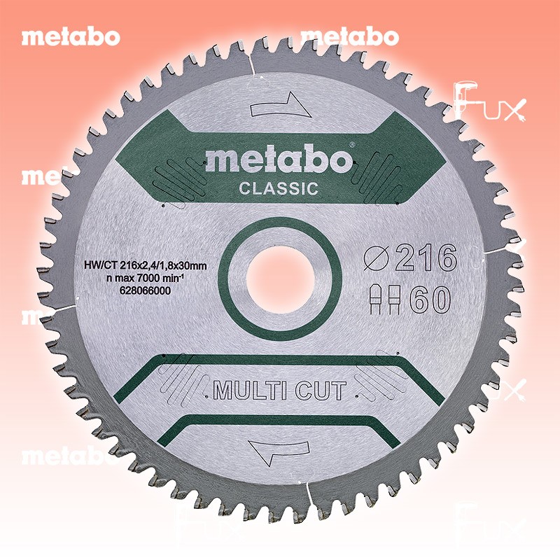 Das Ladenlokal bleibt vom 25. Dezember 2025 bis am 04. Januar 2026 geschlossen. Bestellungen und Lieferungen von Neugeräten werden trotz Ferienabwesenheit in gewohnter Fux-Manier entgegengenommen und ausgeliefert. Zu "Kreissägeblätter »multi cut« " von Metabo Metabo Kreissägeblatt 216 mm classic Bestell- und Artikelnummer: 628066000 Universeller Einsatz bei anspruchsvollen Materialien Bei hohen Ansprüchen an die Schnittqualität, z.B. Laminat, dünnwandige Kunststoff-, Alu-, Kupfer-, Messingprofile Geeignet für viele Anwendungen im Innenausbau Gute Schnittergebnisse auch bei Querschnitten in Vollholz, rohen, beschichteten oder furnierten Spanplatten, MDF Sehr hohe Leistungskraft der Kreissäge notwendig Zum Kreissägeblatt-Finder Technische Daten Durchmesser x Schnittbreite x Bohrung 216 x 2.4 x 30 mm Material HW/CT Zähnezahl 60 Zahnform FZ/TZ Stammblattdicke 1.8 mm Spanwinkel 5° neg. geeignet für KGSV 216 M / KS 216 M Lasercut / KGS 216 M / KGSV 72 Xact / KGSV 72 Xact SYM Verpackung Karton Standard-Ausrüstung Verkaufseinheit 1 Stk. Geliefert im Karton Listenpreis CHF 65.00 Fuxpreis CHF 55.00 inkl. 8.1% MwSt, inkl vRG Versand CHF 15.00 Kein Grauimport! Produkt bestellen Verkaufseinheit 1 Stk. 1 Stück 2 Stück 3 Stück 4 Stück 5 Stück 6 Stück 7 Stück 8 Stück 9 Stück 10 Stück 11 Stück 12 Stück 13 Stück 14 Stück 15 Stück 16 Stück 17 Stück 18 Stück 19 Stück 20 Stück 21 Stück 22 Stück 23 Stück 24 Stück 25 Stück 26 Stück 27 Stück 28 Stück 29 Stück 30 Stück 31 Stück 32 Stück 33 Stück 34 Stück 35 Stück 36 Stück 37 Stück 38 Stück 39 Stück 40 Stück 41 Stück 42 Stück 43 Stück 44 Stück 45 Stück 46 Stück 47 Stück 48 Stück 49 Stück 50 Stück Alle Angaben ohne Gewähr und solange Vorrat reicht!Wiederverkäufer werden?Lehrlingsrabatt? Produkt als PDF AKTION 15%