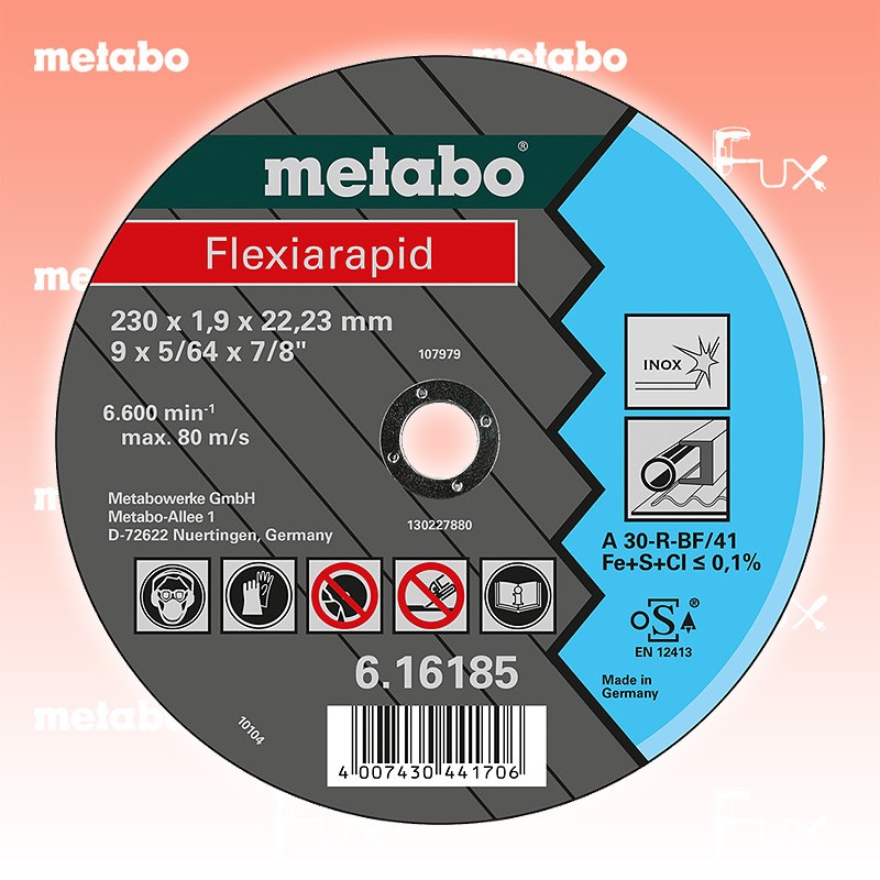 Das Ladenlokal bleibt vom 25. Dezember 2025 bis am 04. Januar 2026 geschlossen. Bestellungen und Lieferungen von Neugeräten werden trotz Ferienabwesenheit in gewohnter Fux-Manier entgegengenommen und ausgeliefert. Zu "Qualitätsklasse A 60-R / A 46-R / A 30-R Trennscheiben" von Metabo Metabo Trennscheibe Stahl 115 mm Bestell- und Artikelnummer: 616181000 Dünne Hochleistungsscheibe speziell für rostfreie, dünnwandige Materialien wie z. B. Rohre, Bleche, Profile, Drähte Härte: hart Sehr hohe Schnittleistung bei hoher Standzeit durch Verwendung von Spezialkorunden Geringer Materialverbrauch, kraftsparend, geringe Maschinenbelastung Eisen-, schwefel- und chlorfrei (Fe + S + Cl ≤ 0,1 %) Arbeitshöchstgeschwindigkeit 80 m/s A 60-R bei 1 mm Stärke; A 46-R bei 1,6 mm Stärke; A 30-R bei 1,9 mm Stärke Technische Daten Qualitätsklasse A 46 R Durchmesser x Dicke x Bohrung 115 x 1,6 x 22.23 mm Ausführung gerade Max. Drehzahl 13300 Standard-Ausrüstung Verkaufseinheit 25 Stk. Listenpreis CHF 87.50 Fuxpreis CHF 74.00 inkl. 8.1% MwSt, inkl vRG Versand CHF 15.00 Kein Grauimport! Produkt bestellen Verkaufseinheit 25 Stk. 1 Stück 2 Stück 3 Stück 4 Stück 5 Stück 6 Stück 7 Stück 8 Stück 9 Stück 10 Stück 11 Stück 12 Stück 13 Stück 14 Stück 15 Stück 16 Stück 17 Stück 18 Stück 19 Stück 20 Stück 21 Stück 22 Stück 23 Stück 24 Stück 25 Stück 26 Stück 27 Stück 28 Stück 29 Stück 30 Stück 31 Stück 32 Stück 33 Stück 34 Stück 35 Stück 36 Stück 37 Stück 38 Stück 39 Stück 40 Stück 41 Stück 42 Stück 43 Stück 44 Stück 45 Stück 46 Stück 47 Stück 48 Stück 49 Stück 50 Stück Alle Angaben ohne Gewähr und solange Vorrat reicht!Wiederverkäufer werden?Lehrlingsrabatt? Produkt als PDF AKTION 15%