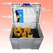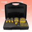 9 Hartmetall-Lochsägen: ø 17 / 21 / 25 / 33 / 41 / 51 / 65 / 76 / 83 mm, 1 HSS-Zentrierbohrer, 8 mm (ø 14 – 30 mm), 1 HSS-Zentrierbohrer, 10 mm (ø 32 – 210 mm), 1 HM-Zentrierbohrer, 8 mm (ø 14 – 30 mm), 1 HM-Zentrierbohrer, 10 mm (ø 32 – 210 mm)