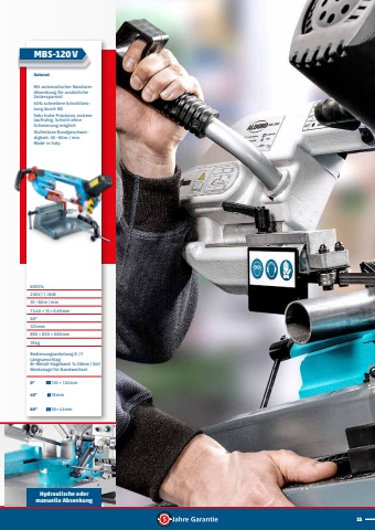 11Hydraulische oder manuelle AbsenkungMit automatischer BandarmAbsenkung f%u00fcr zus%u00e4tzliche Zeitersparnis!60% schnellere Schnittleistung durch NG Sehr hohe Pr%u00e4zision, extrem laufruhig, Schnitt ohneSchmierung m%u00f6glich Stufenlose Bandgeschwindigkeit: 30%u201380m / min.Made in Italy659214230V/1.3kW35%u201380m/min1'440 %u00d7 13 %u00d70.65mm60%u00b0120mm850 %u00d7 830 %u00d7 600mm19kgBedienungsanleitung D / FL%u00e4ngsanschlagBi-Metall-S%u00e4geband 14 Z%u00e4hne/ZollWerkzeuge f%u00fcr Bandwechsel0%u00b0 120 %u00d7 102mm45%u00b0 78mm60%u00b0 50%u00d743mm11MBS-120%u2009V Autocut