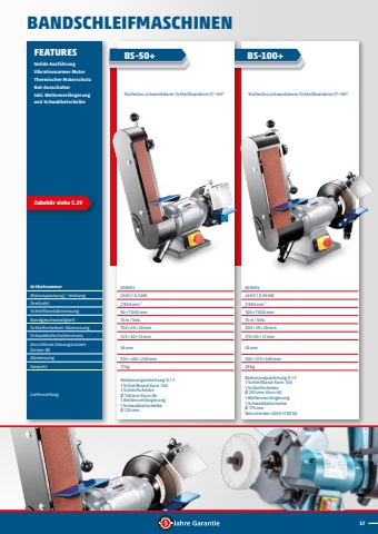 17FEATURESSolide Ausf%u00fchrungVibrationsarmer MotorThermischer MotorschutzNot-AusschalterInkl. Wellenverl%u00e4ngerung und SchwabbelscheibeStufenlos schwenkbarer Schleifbandarm 0%u00b0%u201390%u00b0 Stufenlos schwenkbarer Schleifbandarm 0%u00b0%u201390%u00b0Zubeh%u00f6r siehe S.%u200929659094400V/0.55kW2'850min-1 100%u00d71'000mm15m/Sek.200%u00d7 25%u00d7 20mm175%u00d720%u00d712mm36mm550%u00d7310%u00d7580mm29kgBedienungsanleitung D / F1 Schleifband Korn 1001 Schleifscheibe %u00d8 205mm Korn 601 Wellenverl%u00e4ngerung1 Schwabbelscheibe %u00d8 175mmNetzstecker 400V (CEE16)659092230V/0.3kW2'850min-1 50%u00d71'000mm15m/Sek.150%u00d7 25%u00d720mm125%u00d7 20%u00d7 12mm36mm570%u00d7450%u00d7250mm17kgBedienungsanleitung D / F1 Schleifband Korn 1001 Schleifscheibe %u00d8 150mm Korn 601 Wellenverl%u00e4ngerung1 Schwabbelscheibe %u00d8 125mmArtikelnummerMotorspannung/-leistungDrehzahlSchleifbandabmessungBandgeschwindigkeitSchleifscheiben-AbmessungSchwabbelscheibenmassAnschl%u00fcsse Absaugstutzen (Innen-%u00d8)AbmessungGewichtLieferumfangBANDSCHLEIFMASCHINENBS-50+ BS-100+
