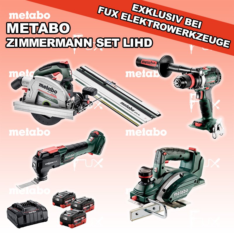 Das Ladenlokal bleibt vom 25. Dezember 2025 bis am 04. Januar 2026 geschlossen. Bestellungen und Lieferungen von Neugeräten werden trotz Ferienabwesenheit in gewohnter Fux-Manier entgegengenommen und ausgeliefert. Heute auf dieses Produkt 27% Rabatt! Zu "Zimmermann Set" von Metabo FULL Service: 36 Monate zum Nulltarif für Sie! Weitere Infos zum FULL Service Dieses Produkt ist CAS kompatibel! Weitere Infos zu CAS Sparfux Aktionen FUX SPECIAL EXKLUSIV BEI FUX Metabo Zimmermann SET 6 LiHD Bestell- und Artikelnummer: Zimmermann SET 6 LiHD BS 18 LTX BL Q I Akku-BohrschrauberAkkuspannung 18 V Drehzahl 0-550 / 0-2000 U/min Drehmoment hart / weich 130 / 65 Nm Gewicht (mit Akkupack) 2.3 kgInfos MT 18 LTX BL QSL Akku-Multitool Akkuspannung 18 V Schwingzahl bei Leerlauf 8.000 - 20.000 /min Schleifplatte, Maß Eck zu Eck 93 mm Gewicht 1.7 kgInfos HO 18 LTX 20-82 Akku-Einhand-HobelAkkuspannung 18 V Hobelbreite 82 mm Spanabnahme einstellbar 0-2 mm Gewicht 3.5 KgInfos KS 18 LTX 66 BL Akku HandkreissägeAkkuspannung 18 V Schnitt-Tiefe bei 90° 0-66 mm Sägeblatt 165 mm Gewicht 4.5 kgInfos Kappschiene KFS 44Gesamtlänge 834 mm Schnittlänge 440 mmInfos 3 x 18 V, 5.5 Ah, LiHD Akkupack18 V 5.5 Ah ( LiHD Akkus ) Infos ASC 145, 12 - 36 V "Air Cooled" LadegerätZum Aufladen aller Li-Power Schiebesitz-Akkupacks (12 V - 36 V). Ladestrom 8.0 AInfos Registriere die in diesem Set vorhandenen Metabo Maschinen auf metabo.ch, und ergattere dir bis zu 5 Gratis Akkus!Zusätzlich offerieren wir zu diesem Set einen Gratis Akku! Standard-Ausrüstung In diesem Set enthalten: BS 18 LTX BL Q I Akku-Bohrschrauber MT 18 LTX BL QSL Akku-Multitool HO 18 LTX 20-82 Akku-Einhand-Hobel KS 18 LTX 66 BL Akku Handkreissäge Kappschiene KFS 44 3 x 18 V, 5.5 Ah, LiHD Akkupack ASC 145, 12 - 36 V "Air Cooled" Ladegerät Listenpreis CHF 2'036.50 Fuxpreis CHF 1'472.00 inkl. 8.1% MwSt, inkl vRG Versand CHF 25.00 Kein Grauimport! Produkt bestellen 1 Stück 2 Stück 3 Stück 4 Stück 5 Stück 6 Stück 7 Stück 8 Stück 9 Stück 10 Stück Alle Angaben ohne Gewähr und solange Vorrat reicht!Wiederverkäufer werden? Produkt als PDF NEUHEITAKTION 27%