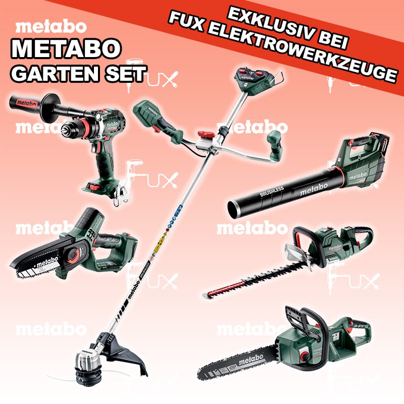 Zu "Garten Set" von Metabo FUX SPECIAL EXKLUSIV BEI FUX Metabo Garten Set 9 SOLO Bestell- und Artikelnummer: Garten Set 9 SOLO FULL Service: 36 Monate zum Nulltarif für Sie! Weitere Infos zum FULL Service Dieses Produkt ist CAS kompatibel! Weitere Infos zu CAS BS 18 LTX BL Q I Akku-BohrschrauberAkkuspannung 18 V Drehzahl 0-550 / 0-2000 U/min Drehmoment hart / weich 130 / 65 Nm Gewicht (mit Akkupack) 2.3 kgInfos MS 18 LTX 15 Akku-AstsägeAkkuspannung 18 V Schnittlänge 15 cm Max. Kettengeschwindigkeit 5 m/s Gewicht ohne Akkupack 1,6 kgInfos LB 18 LTX BL Akku-GebläseAkkuspannung 18 V Luftmenge 650 m³/h Leerlaufdrehzahl 0 - 20300 /min Gewicht (mit Akkupack) 2.5 kgInfos MS 36-18 LTX BL 40 Akku-KettensägeAkkuspannung 18 V Schnittlänge 36 cm Max. Kettengeschwindigkeit 22 m/s Gewicht mit Akkupack 4,6 kgInfos HS 18 LTX BL 55 Akku-Heckenschere Akkuspannung 18 V Schnittzahl bei Leerlauf 3.400 /min Schnittlänge 50 cm Gewicht ohne Akkupack 4,4 kgInfos FSB 36-18 LTX BL 40 Akku-RasentrimmerAkkuspannung 2 x 18 V Schnittkreisdurchmesser 40 cm Leerlaufdrehzahl 0 - 6.000 /min Gewicht (mit Akkupack) 4,7 kgInfos Registriere die in diesem Set vorhandenen Metabo Maschinen auf metabo.ch, und ergattere dir bis zu 5 Gratis Akkus!Zusätzlich offerieren wir zu diesem Set einen Gratis Akku!OHNE AKKUS UND LADEGERÄT Standard-Ausrüstung In diesem Set enthalten: BS 18 LTX BL Q I Akku-Bohrschrauber MS 18 LTX 15 Akku-Astsäge LB 18 LTX BL Akku-Gebläse MS 36-18 LTX BL 40 Akku-Kettensäge HS 18 LTX BL 55 Akku-Heckenschere FSB 36-18 LTX BL 40 Akku-Rasentrimmer Zubehör Listenpreis CHF 2'024.00 Fuxpreis CHF 1'463.00 inklusive 8.1% MwSt Versand CHF 30.00 Kein Grauimport! Produkt bestellen 1 Stück 2 Stück 3 Stück 4 Stück 5 Stück 6 Stück 7 Stück 8 Stück 9 Stück 10 Stück Alle Angaben ohne Gewähr und solange Vorrat reicht!Wiederverkäufer werden? Produkt als PDFVideo LiHD 1Video LiHD 2 AKTION 27%